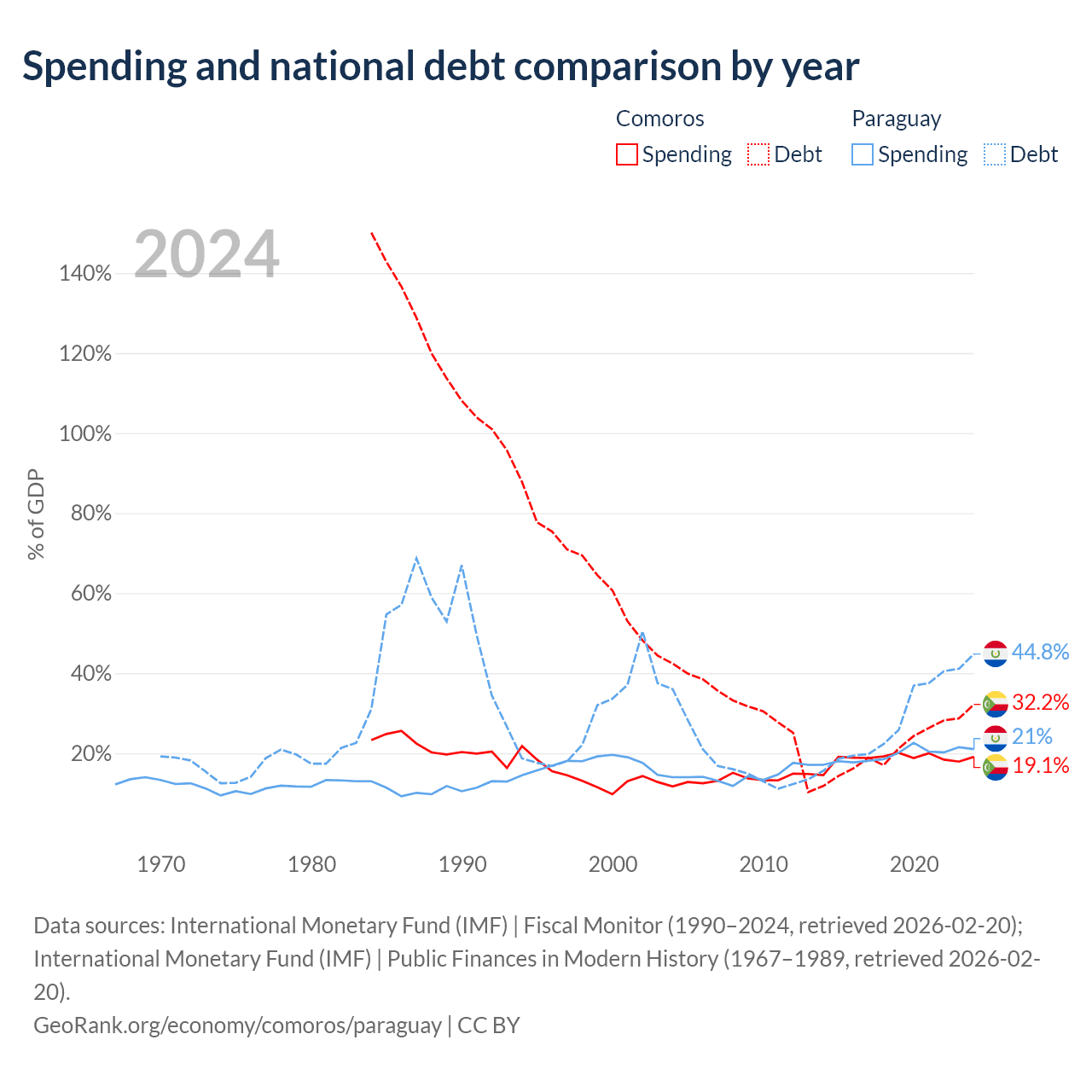 Comoros has $463M in government debt (32.2% of GDP), compared to $19.9B (44.8% of GDP) in Paraguay.