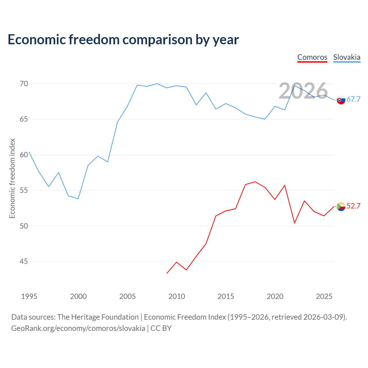 The Economic Freedom Index for Comoros is 52.7, ranking 145/197, compared to 67.7 for Slovakia, ranking 54/197. The chart above displays a comparison of annual changes in economic freedom indexes.