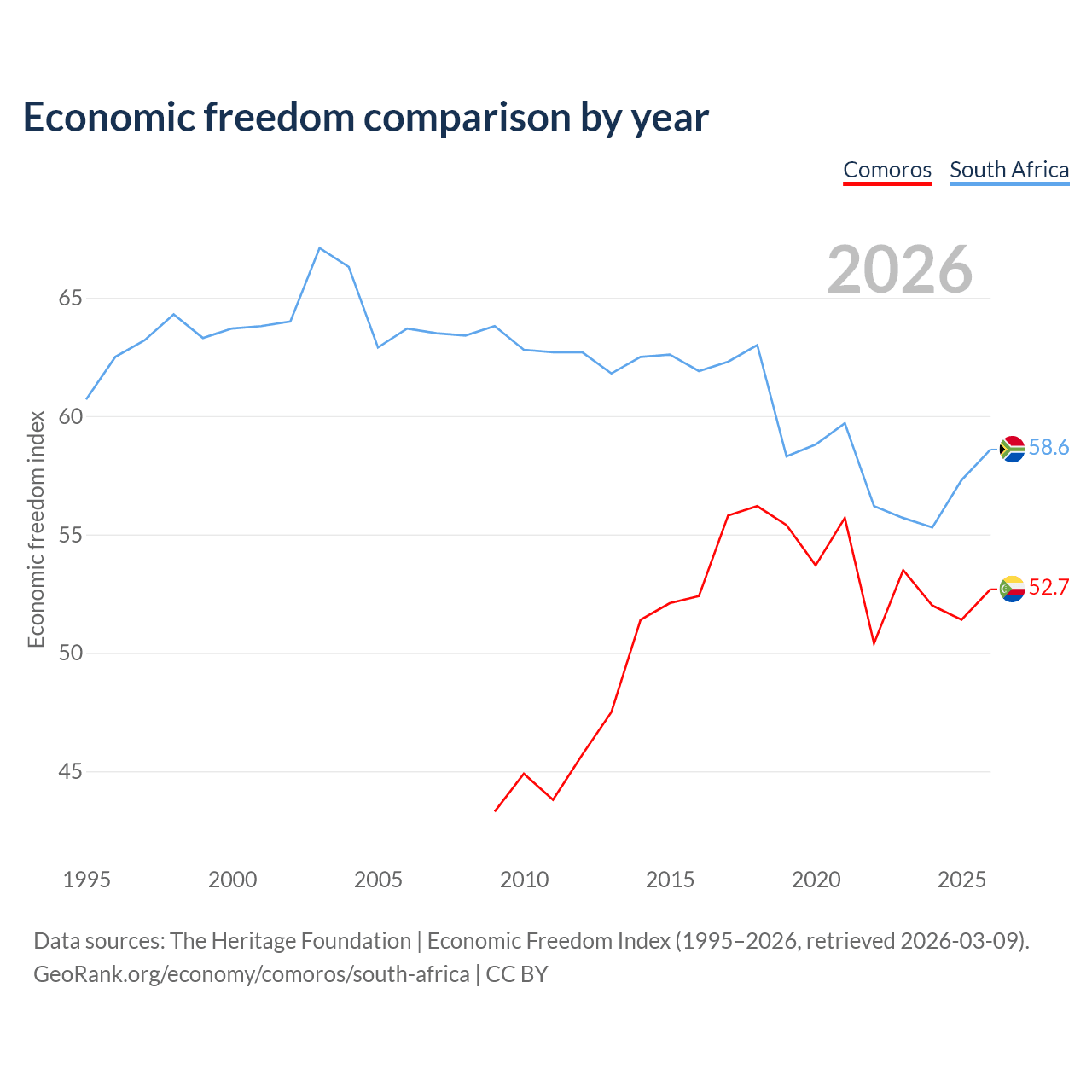 The Economic Freedom Index for Comoros is 52.7, ranking 145/197, compared to 58.6 for South Africa, ranking 110/197. The chart above displays a comparison of annual changes in economic freedom indexes.