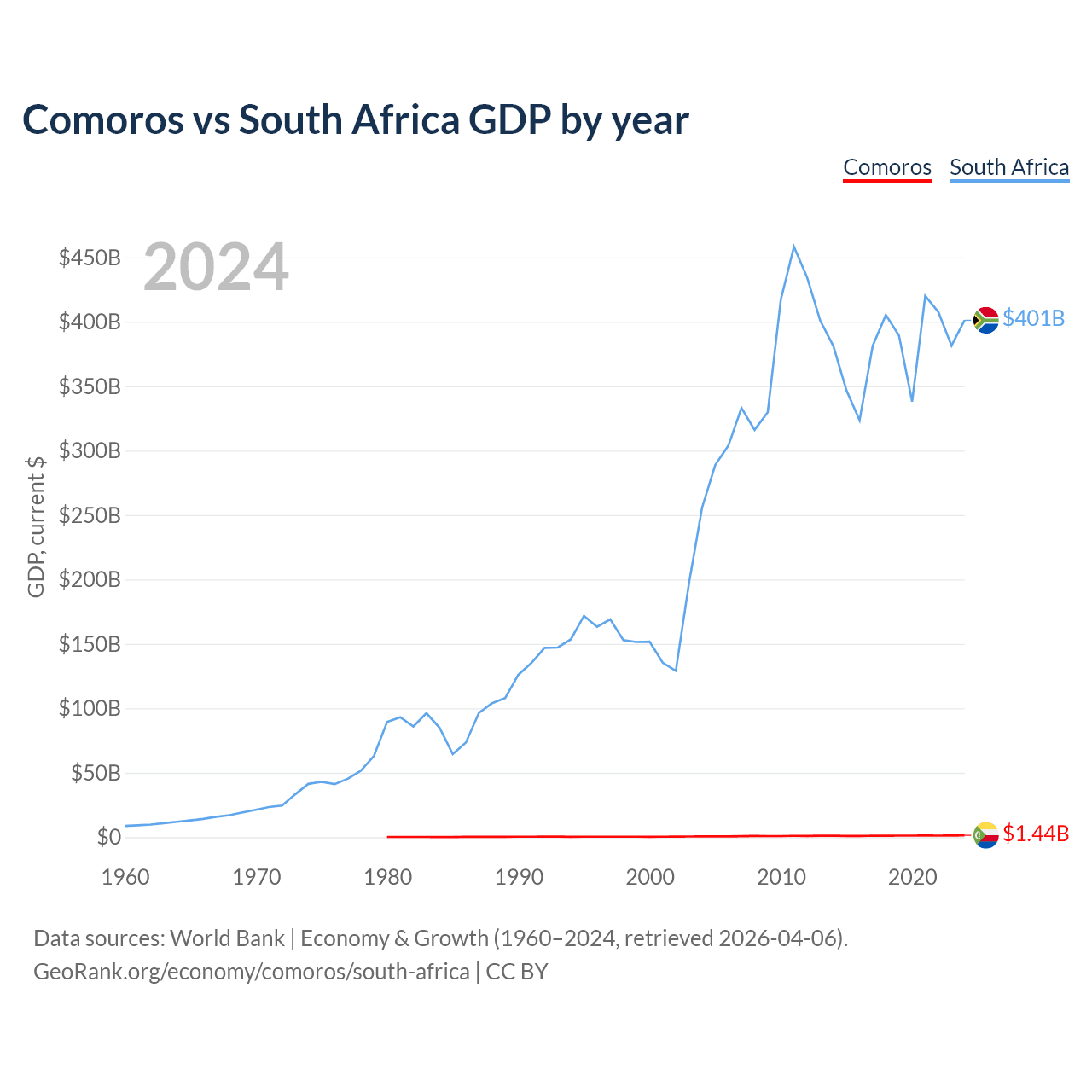 Comoros has a GDP of $1.44B compared to $401B for South Africa, ranking 183/197 and 40/197 by economy size, respectively.