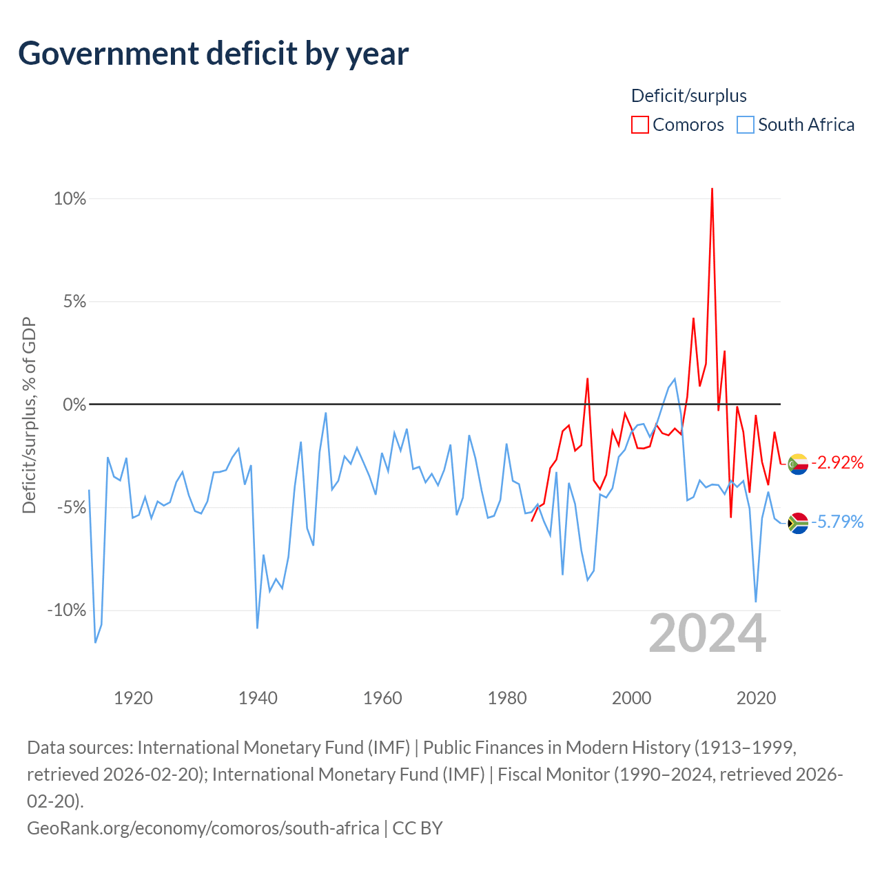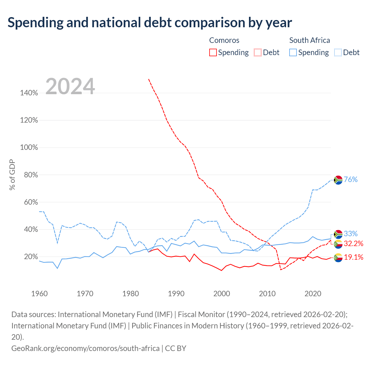 Comoros has $463M in government debt (32.2% of GDP), compared to $305B (76% of GDP) in South Africa.