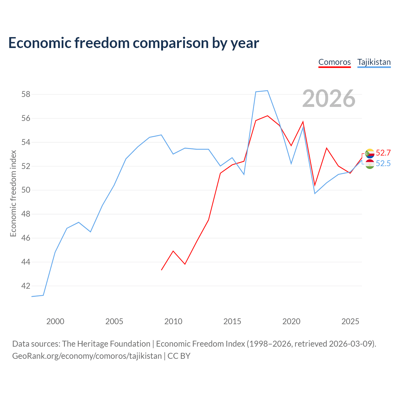 The Economic Freedom Index for Comoros is 52.7, ranking 145/197, compared to 52.5 for Tajikistan, ranking 147/197. The chart above displays a comparison of annual changes in economic freedom indexes.