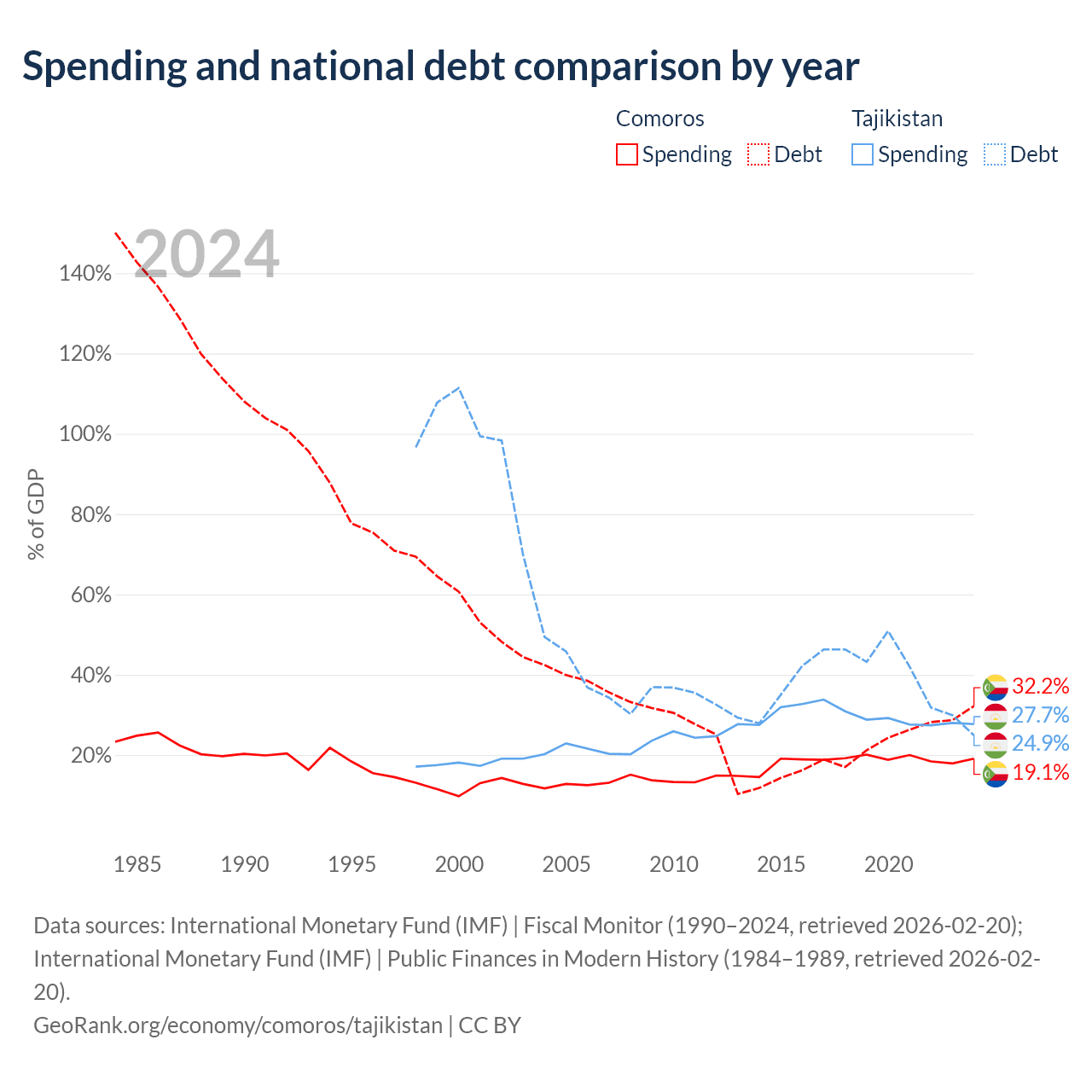 Comoros has $463M in government debt (32.2% of GDP), compared to $3.54B (24.9% of GDP) in Tajikistan.