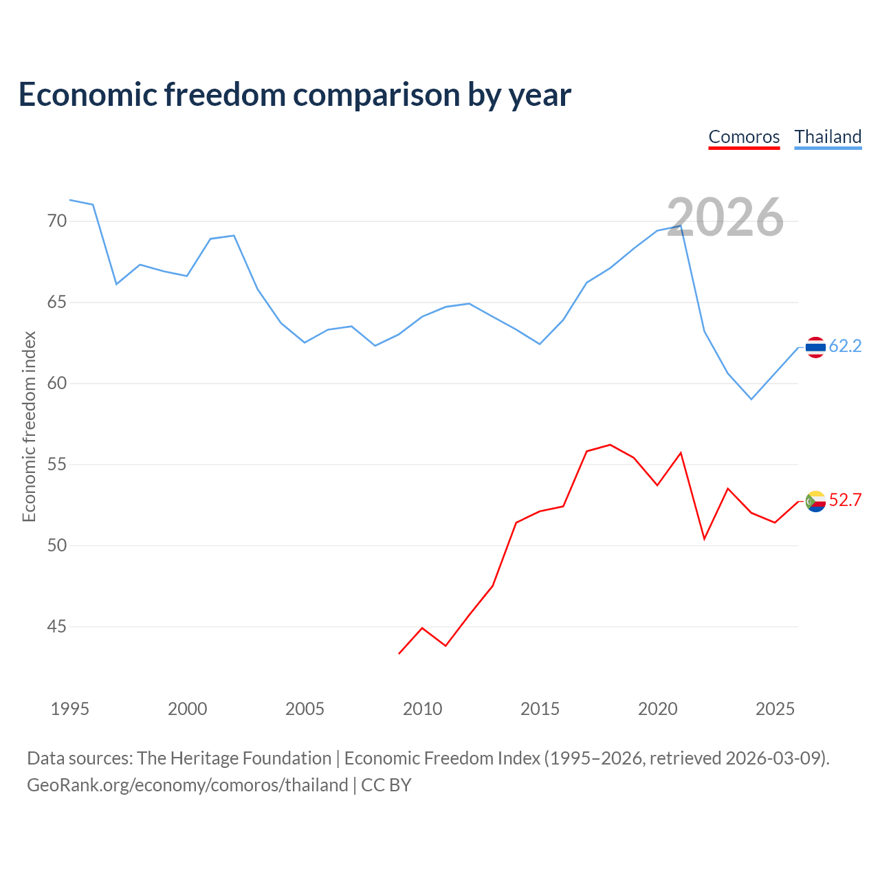 The Economic Freedom Index for Comoros is 52.7, ranking 145/197, compared to 62.2 for Thailand, ranking 88/197. The chart above displays a comparison of annual changes in economic freedom indexes.