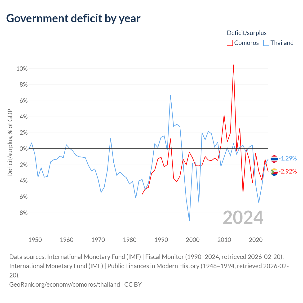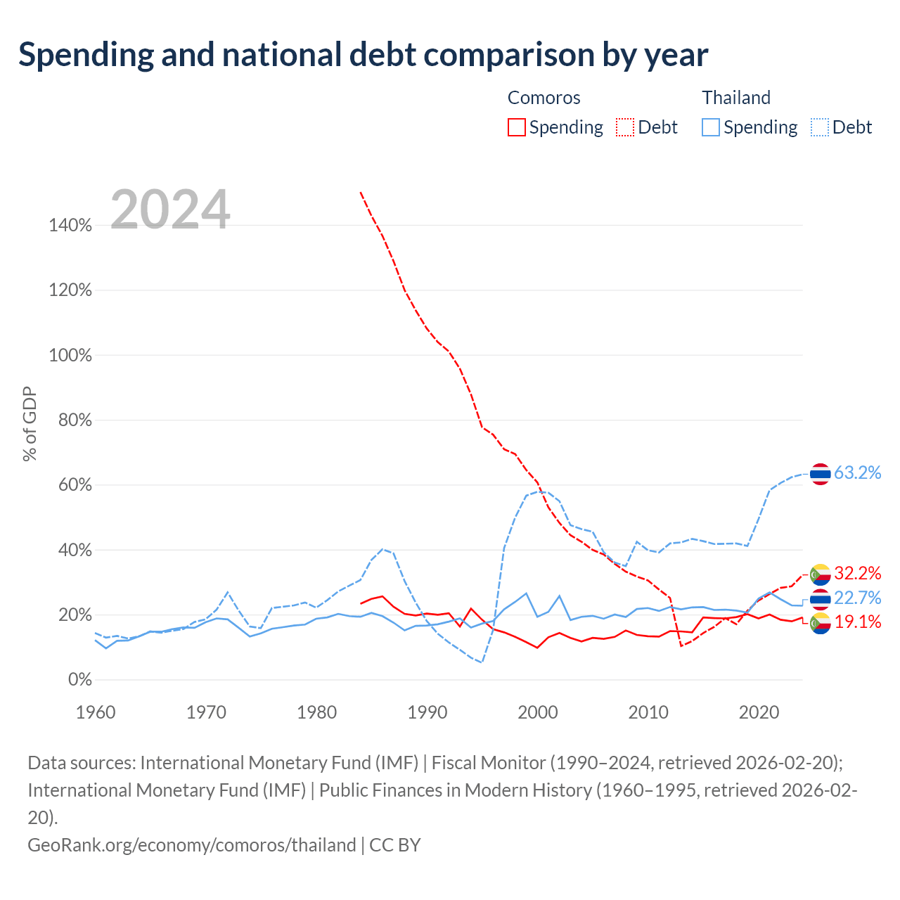 Comoros has $463M in government debt (32.2% of GDP), compared to $333B (63.2% of GDP) in Thailand.