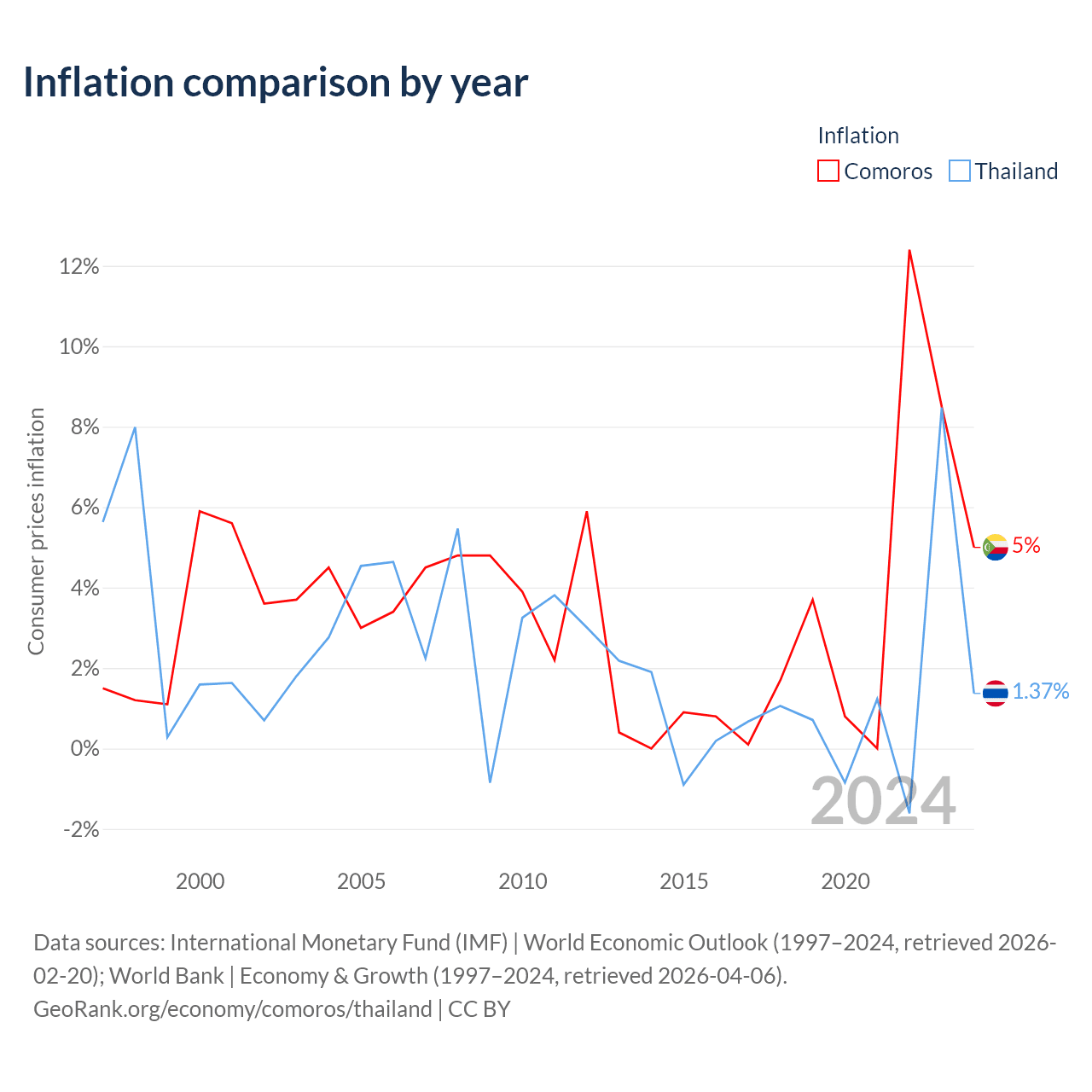 Comoros has a GDP of $1.44B compared to $527B for Thailand, ranking 183/197 and 31/197 by economy size, respectively.