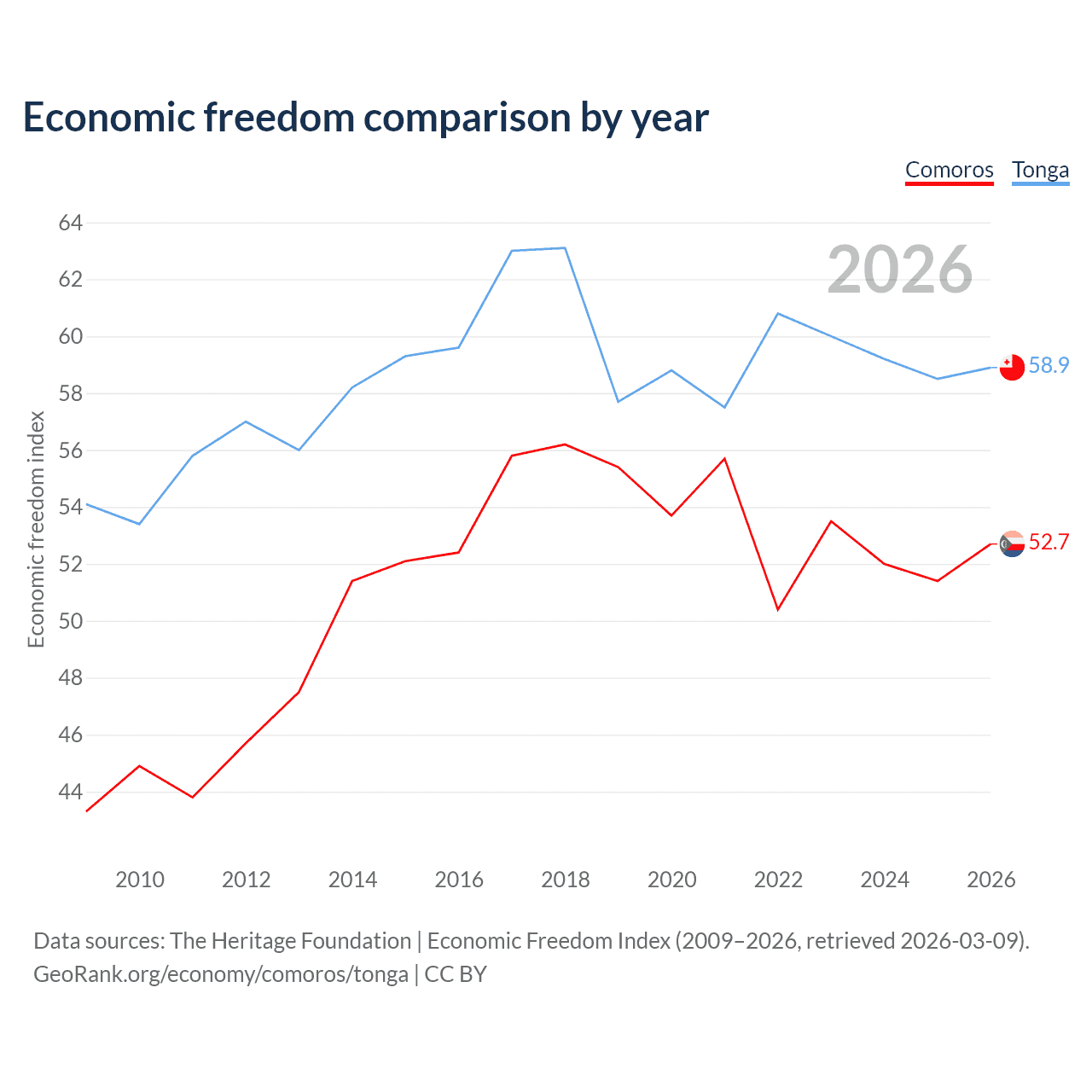 The Economic Freedom Index for Comoros is 52.7, ranking 145/197, compared to 58.9 for Tonga, ranking 107/197. The chart above displays a comparison of annual changes in economic freedom indexes.