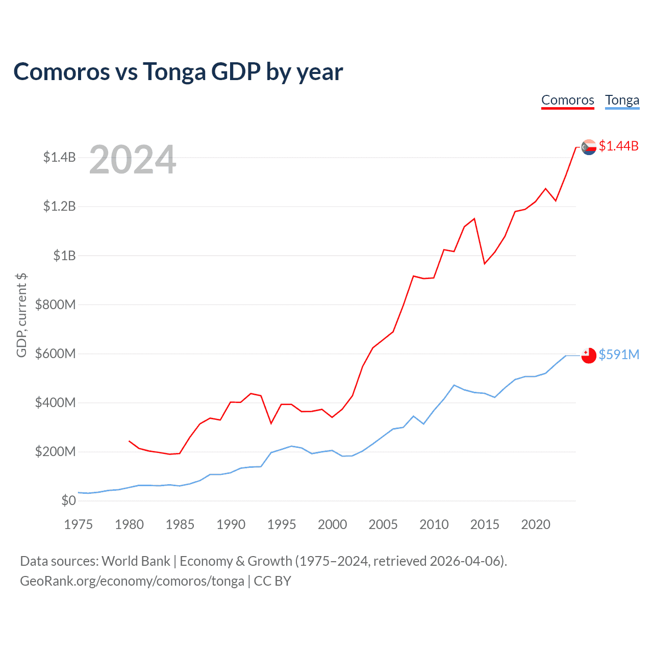 Comoros has a GDP of $1.44B compared to $591M for Tonga, ranking 183/197 and 191/197 by economy size, respectively.