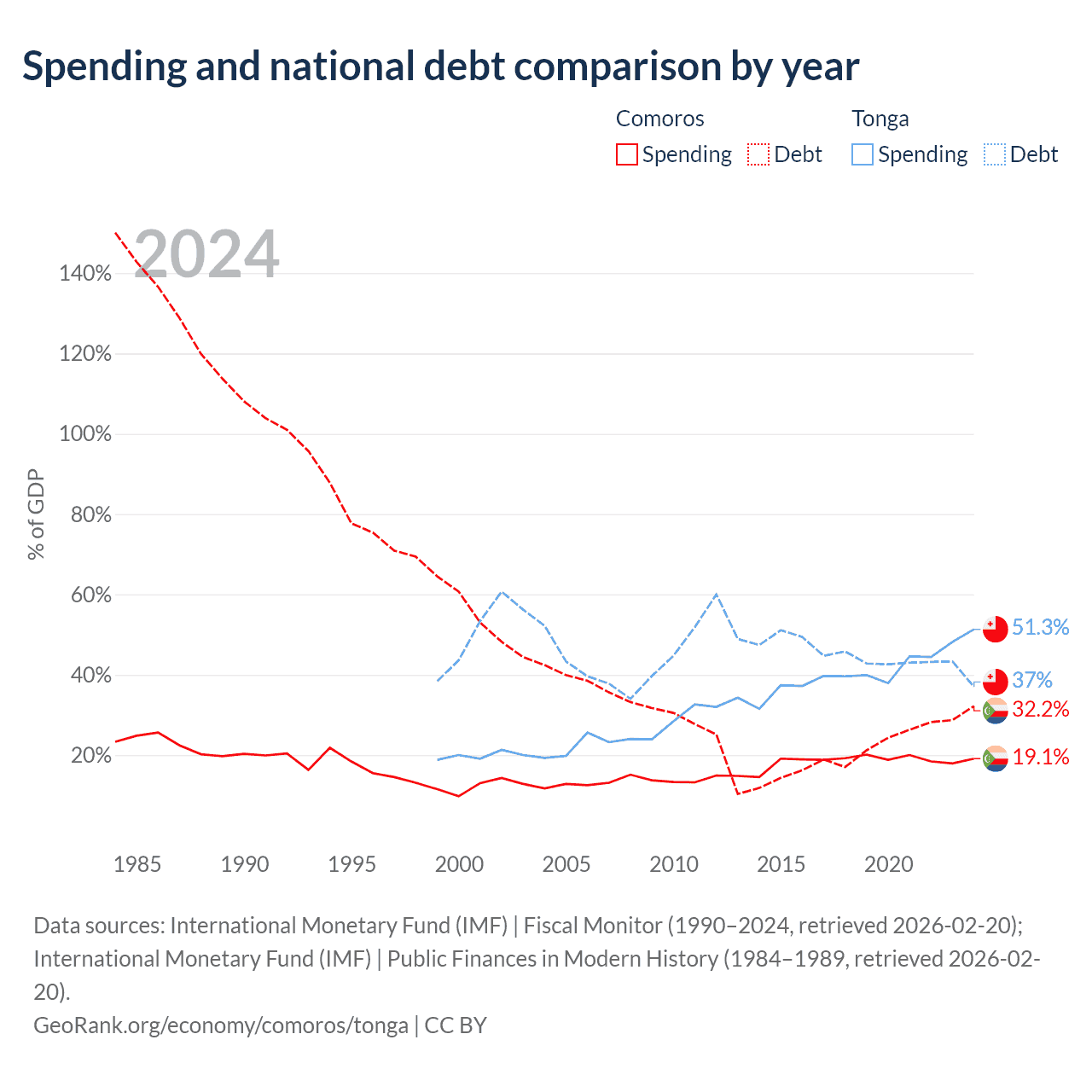 Comoros has $463M in government debt (32.2% of GDP), compared to $256M (37% of GDP) in Tonga.