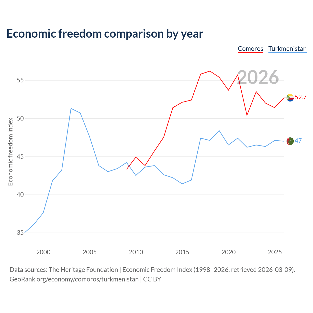 The Economic Freedom Index for Comoros is 52.7, ranking 145/197, compared to 47 for Turkmenistan, ranking 177/197. The chart above displays a comparison of annual changes in economic freedom indexes.