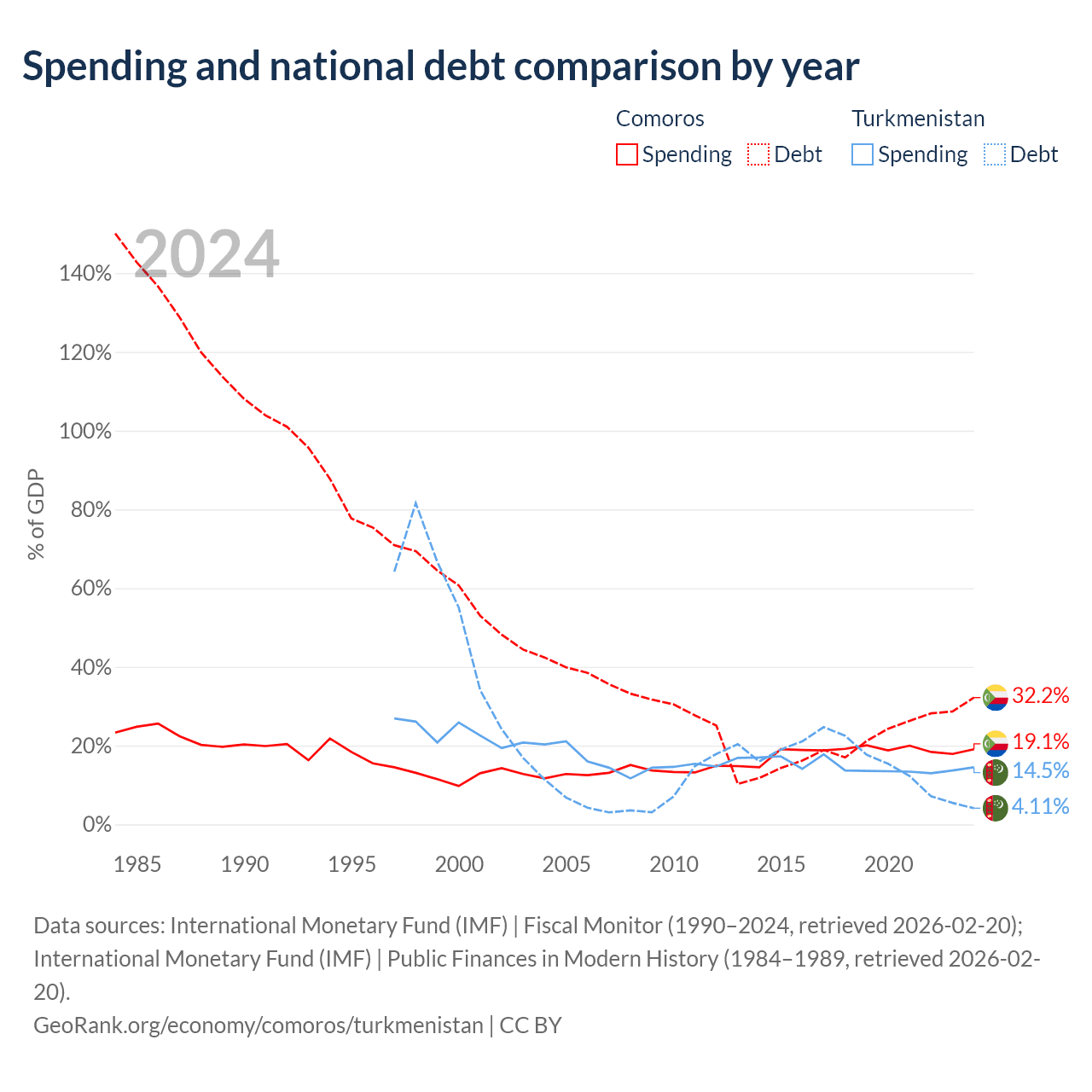 Comoros has $463M in government debt (32.2% of GDP), compared to $2.11B (4.11% of GDP) in Turkmenistan.