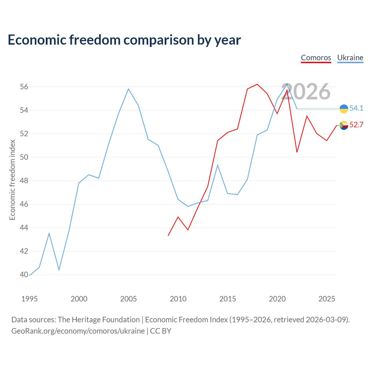 The Economic Freedom Index for Comoros is 52.7, ranking 145/197, compared to 54.1 for Ukraine, ranking 135/197. The chart above displays a comparison of annual changes in economic freedom indexes.