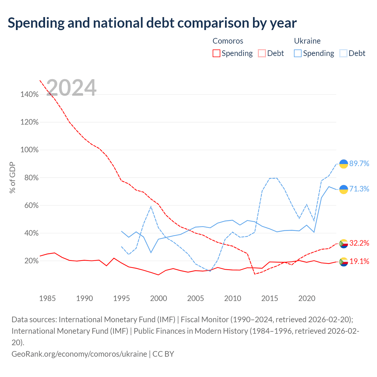 Comoros has $463M in government debt (32.2% of GDP), compared to $171B (89.7% of GDP) in Ukraine.