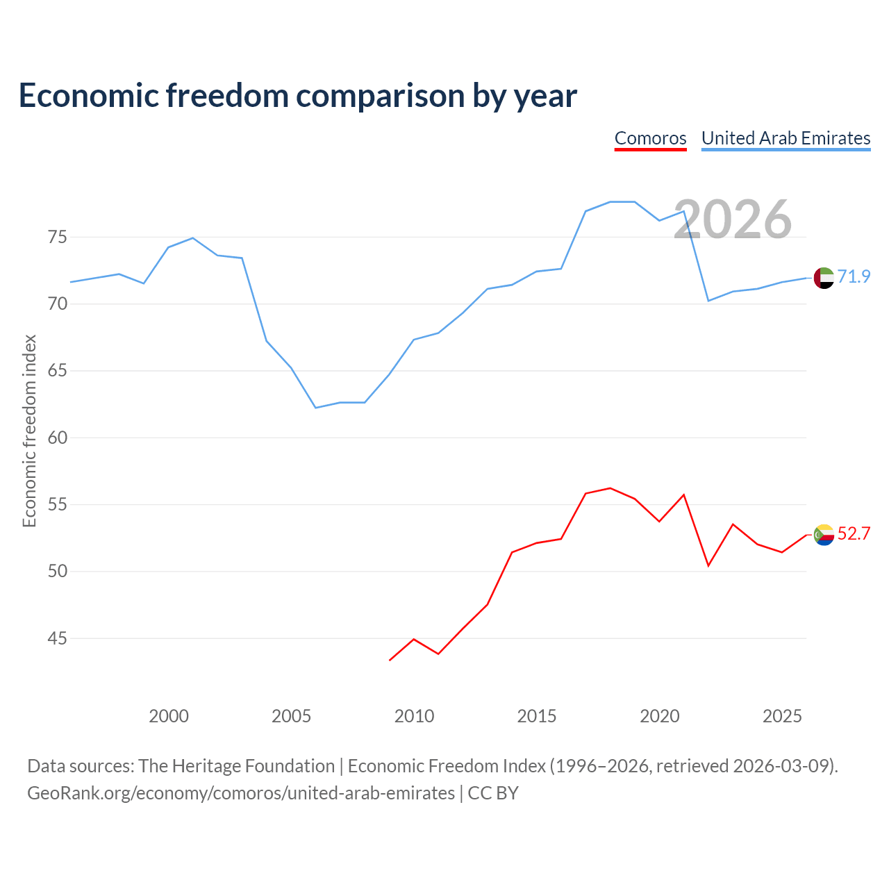 The Economic Freedom Index for Comoros is 52.7, ranking 145/197, compared to 71.9 for the United Arab Emirates, ranking 29/197. The chart above displays a comparison of annual changes in economic freedom indexes.