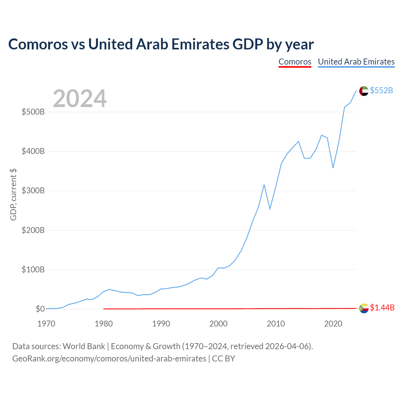 Comoros has a GDP of $1.44B compared to $552B for the United Arab Emirates, ranking 183/197 and 27/197 by economy size, respectively.