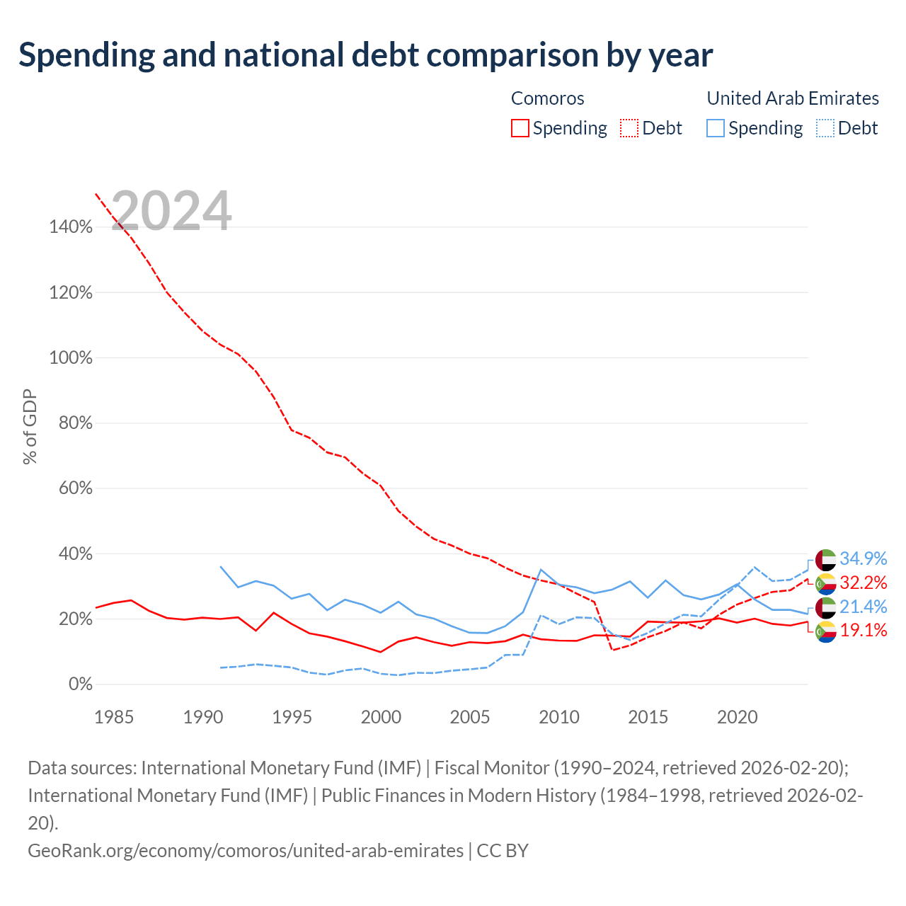 Comoros has $463M in government debt (32.2% of GDP), compared to $193B (34.9% of GDP) in the United Arab Emirates.