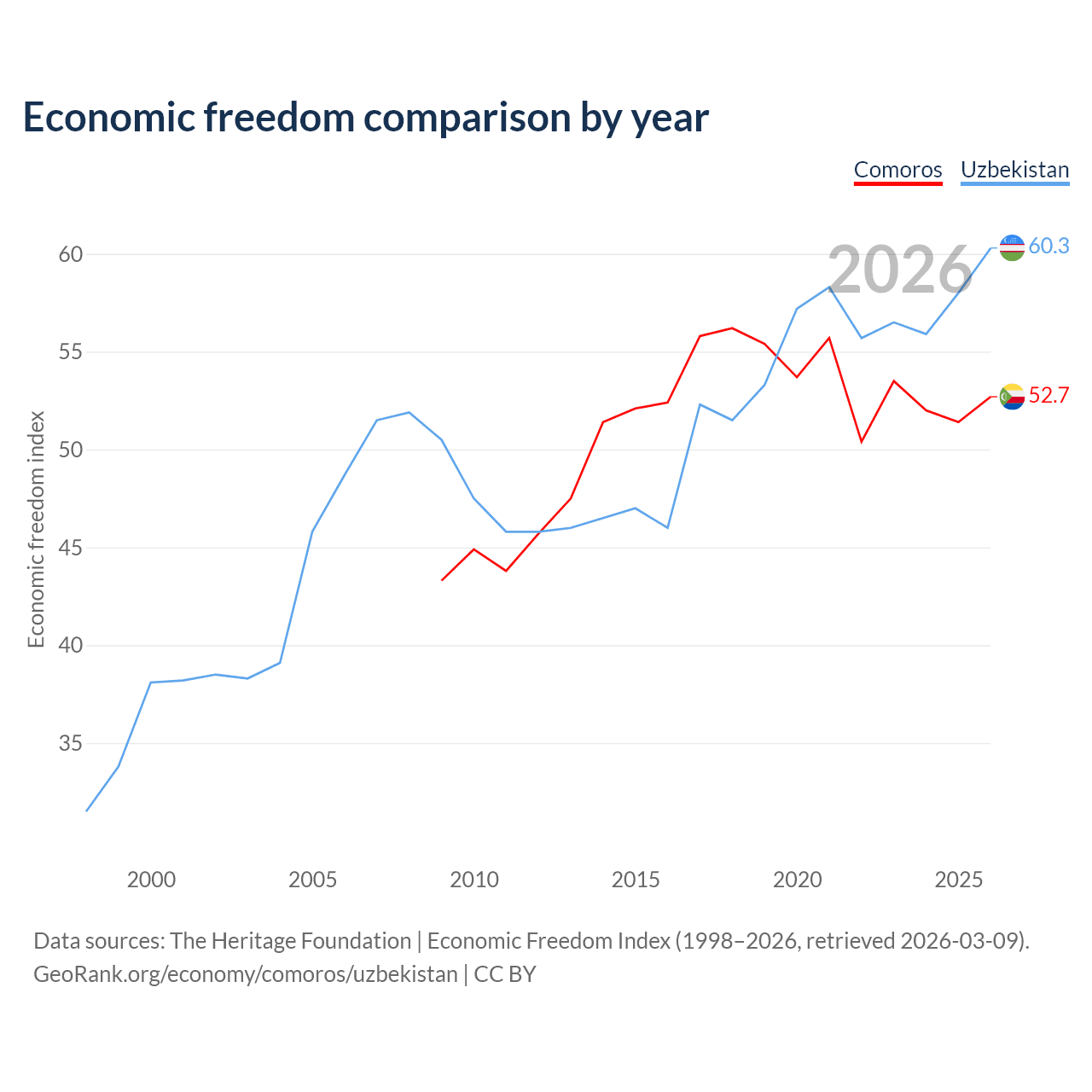 The Economic Freedom Index for Comoros is 52.7, ranking 145/197, compared to 60.3 for Uzbekistan, ranking 94/197. The chart above displays a comparison of annual changes in economic freedom indexes.