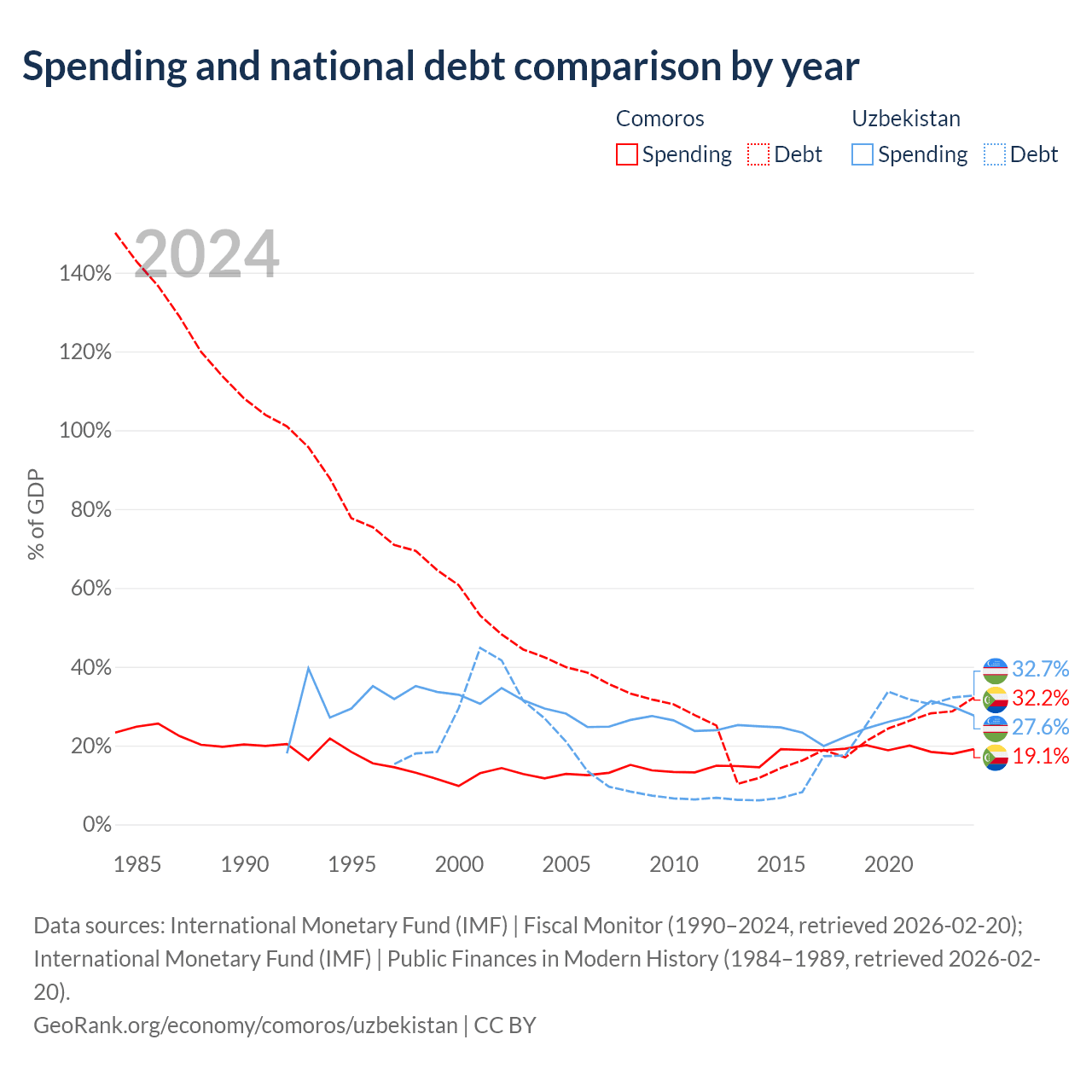 Comoros has $463M in government debt (32.2% of GDP), compared to $37.5B (32.7% of GDP) in Uzbekistan.
