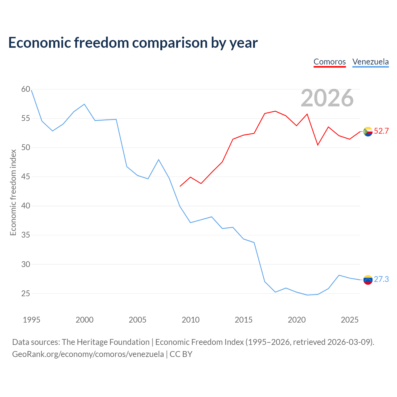 The Economic Freedom Index for Comoros is 52.7, ranking 145/197, compared to 27.3 for Venezuela, ranking 194/197. The chart above displays a comparison of annual changes in economic freedom indexes.