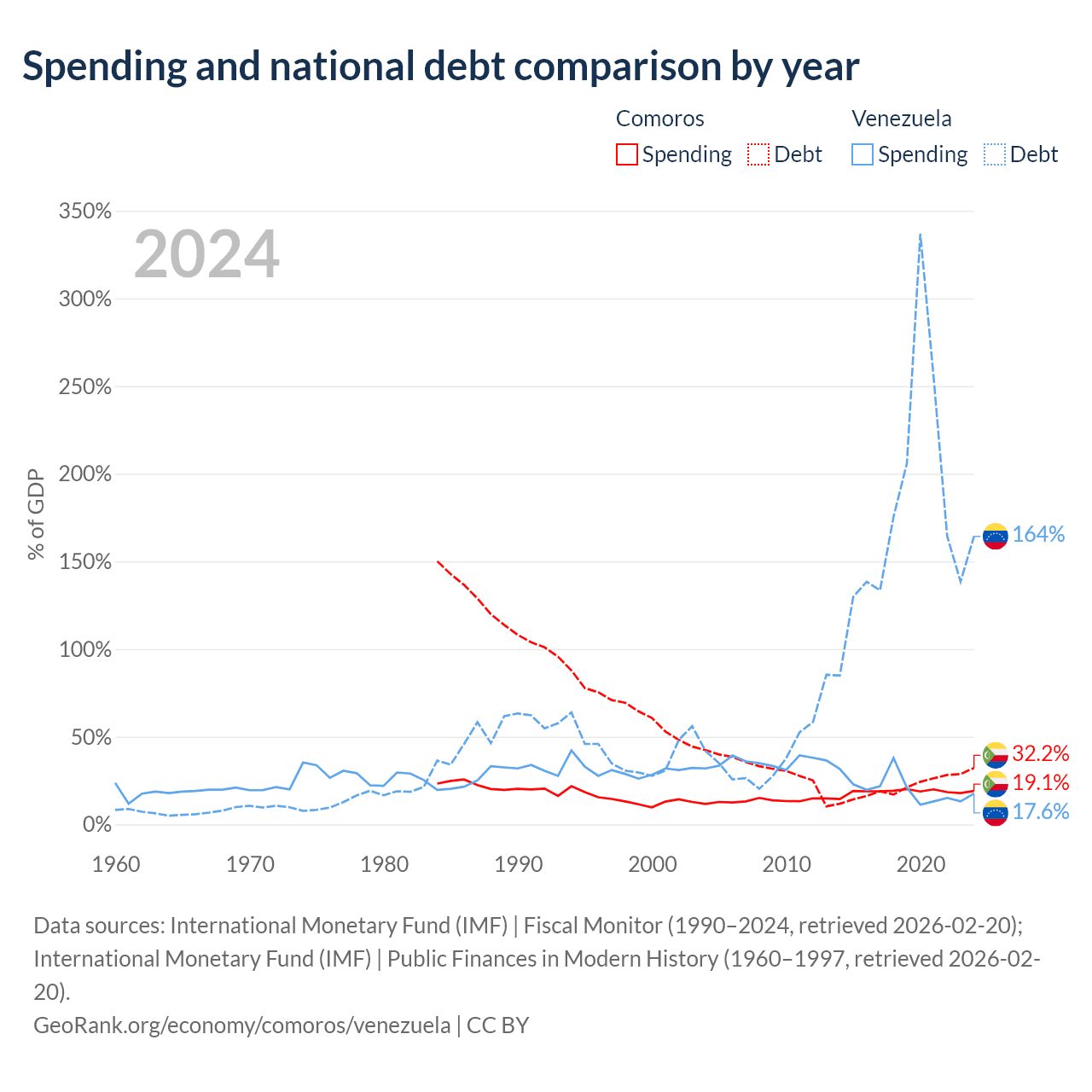Comoros has $463M in government debt (32.2% of GDP), compared to $197B (164.3% of GDP) in Venezuela.