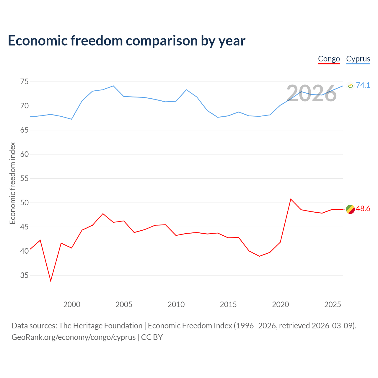 The Economic Freedom Index for the Congo is 48.6, ranking 169/197, compared to 74.1 for Cyprus, ranking 21/197. The chart above displays a comparison of annual changes in economic freedom indexes.