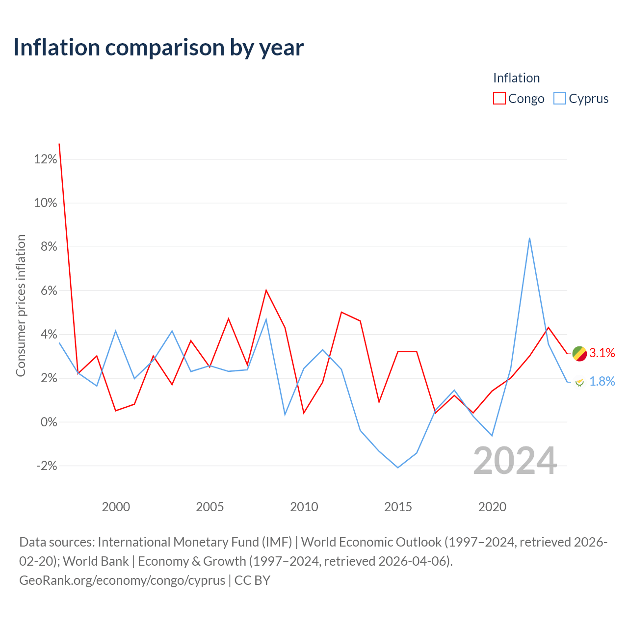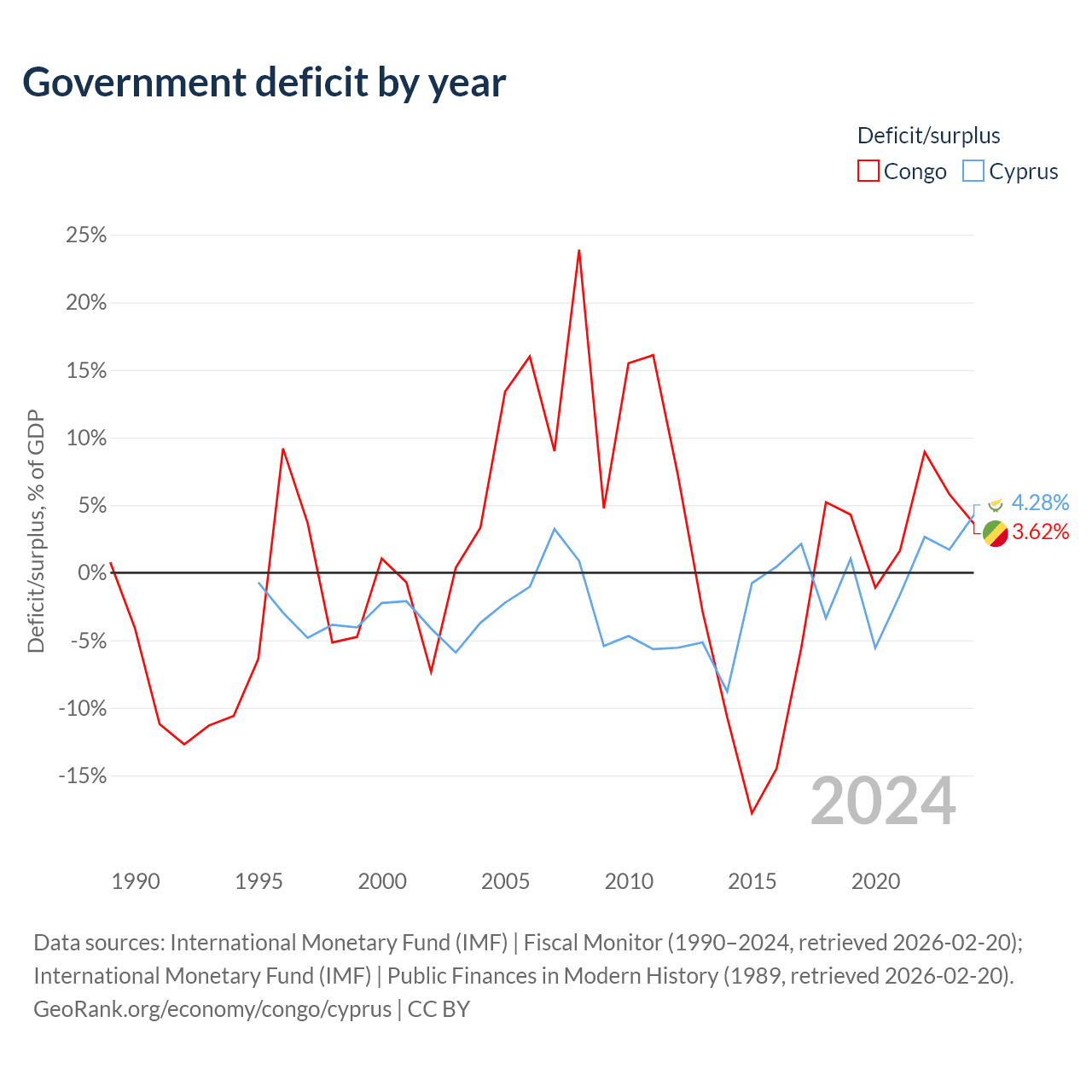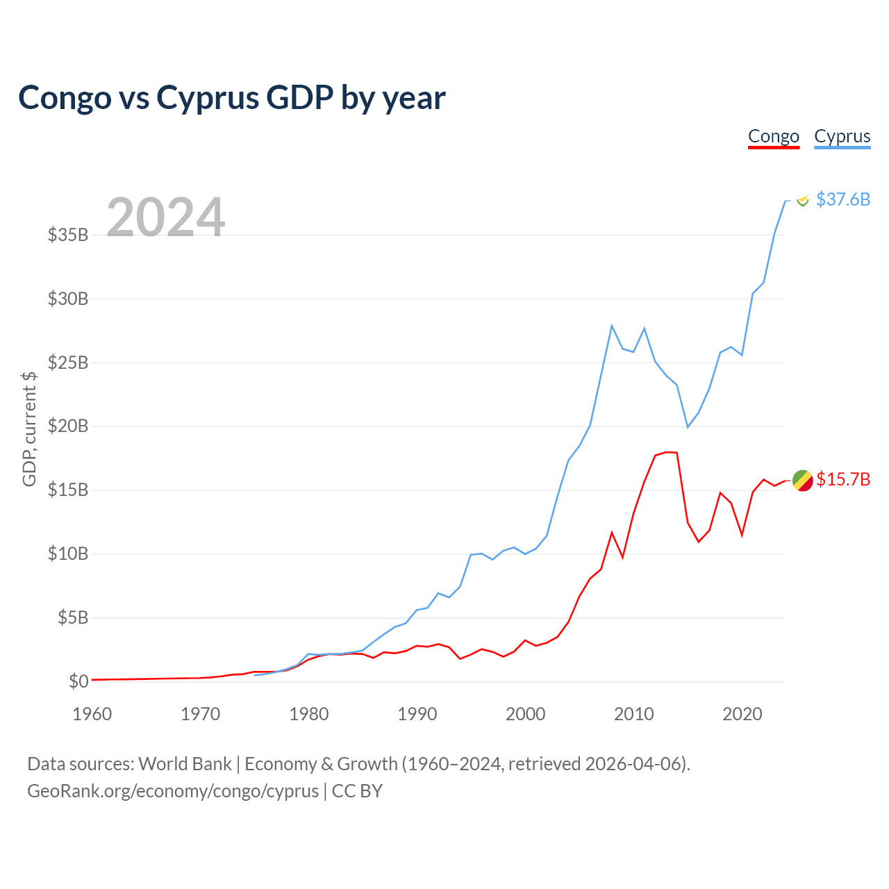 The Congo has a GDP of $15.7B compared to $37.6B for Cyprus, ranking 141/197 and 103/197 by economy size, respectively.