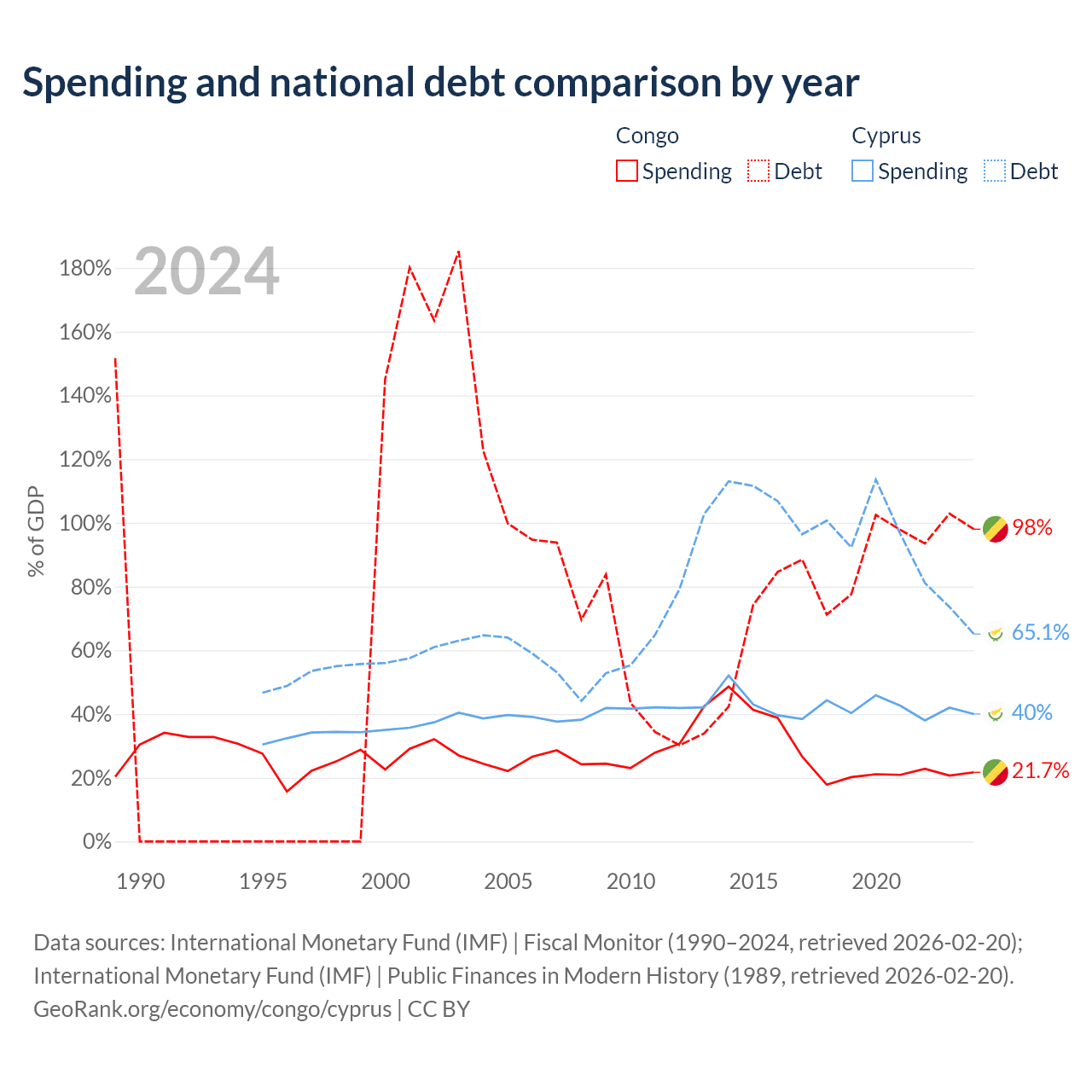The Congo has $15.4B in government debt (98% of GDP), compared to $24.5B (65.1% of GDP) in Cyprus.