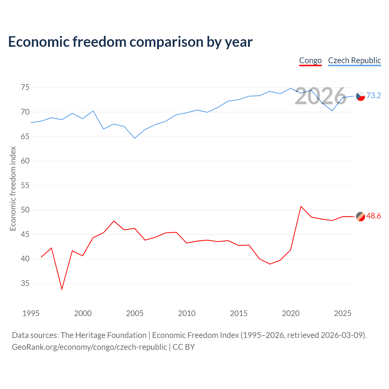 The Economic Freedom Index for the Congo is 48.6, ranking 169/197, compared to 73.2 for the Czech Republic, ranking 25/197. The chart above displays a comparison of annual changes in economic freedom indexes.