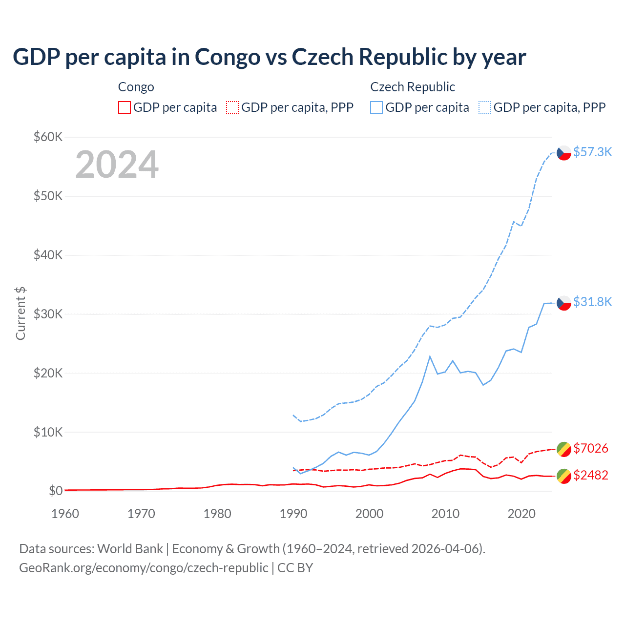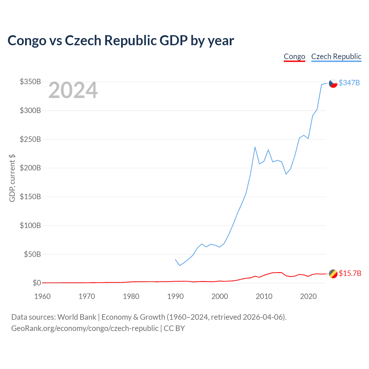 The Congo has a GDP of $15.7B compared to $347B for the Czech Republic, ranking 141/197 and 44/197 by economy size, respectively.