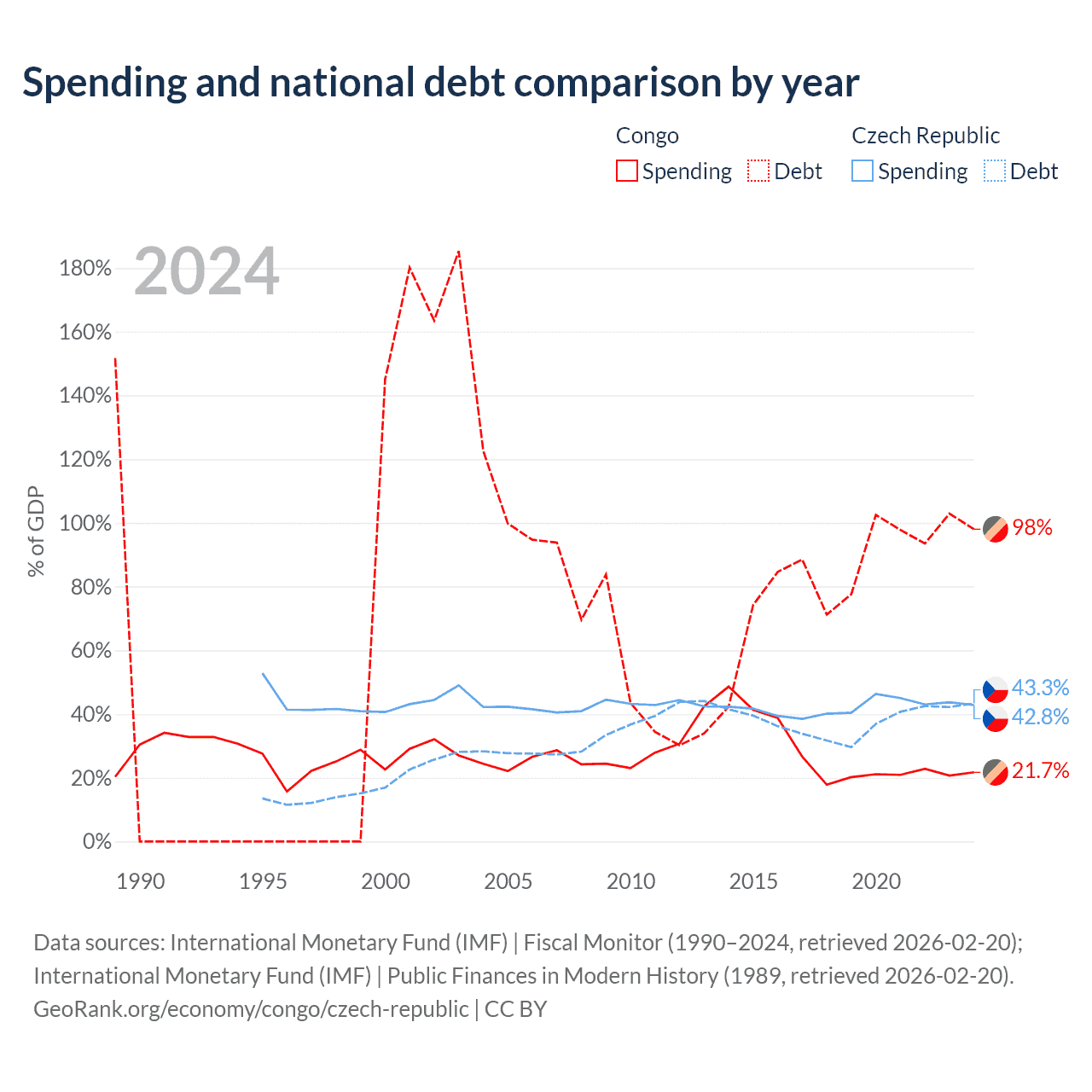 The Congo has $15.4B in government debt (98% of GDP), compared to $150B (43.3% of GDP) in the Czech Republic.