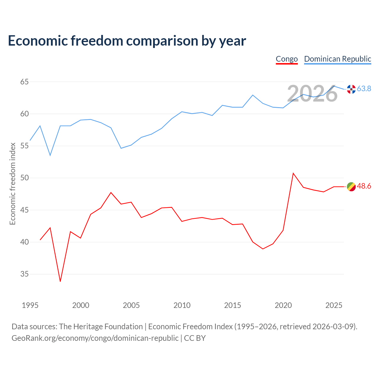 The Economic Freedom Index for the Congo is 48.6, ranking 169/197, compared to 63.8 for the Dominican Republic, ranking 77/197. The chart above displays a comparison of annual changes in economic freedom indexes.