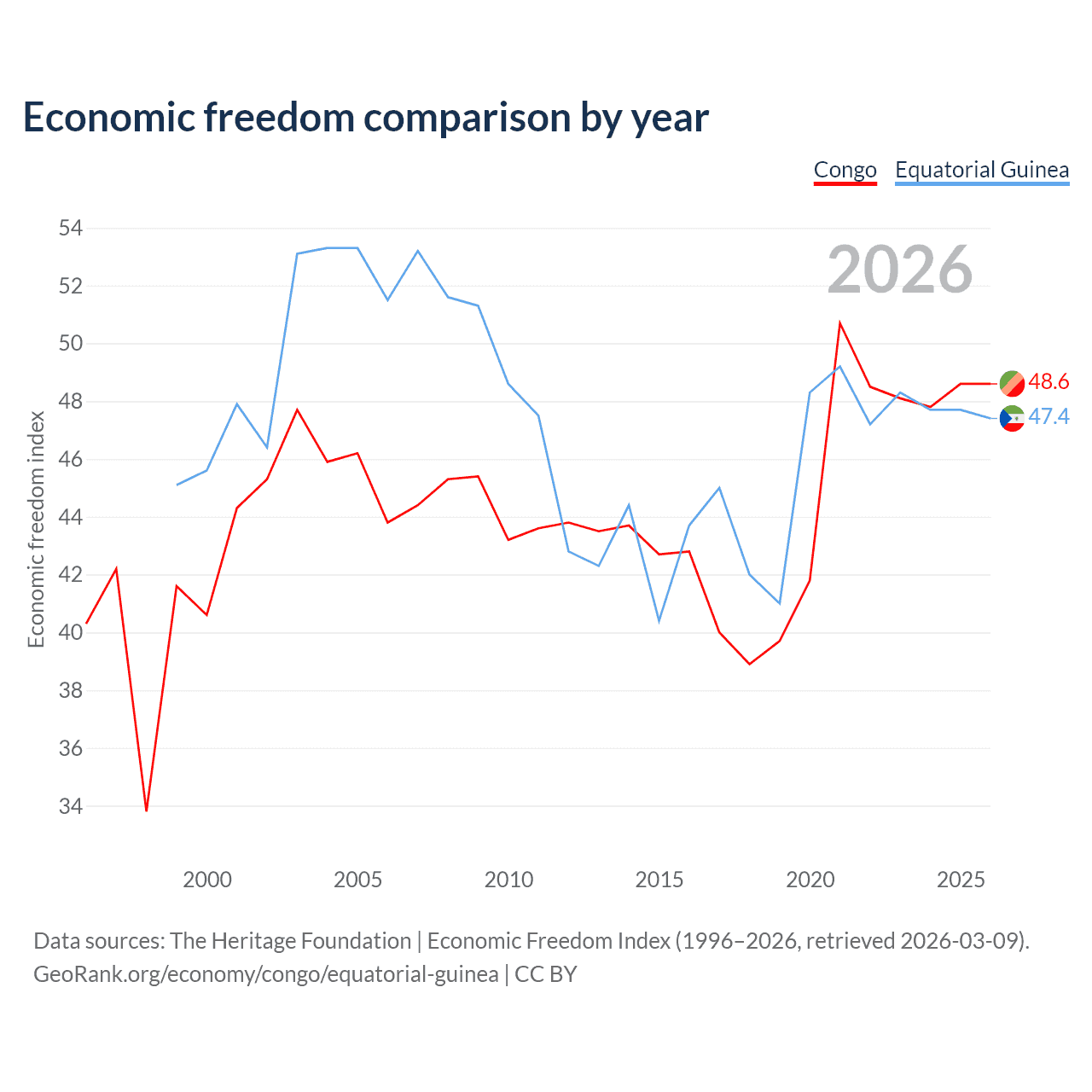 The Economic Freedom Index for the Congo is 48.6, ranking 169/197, compared to 47.4 for Equatorial Guinea, ranking 175/197. The chart above displays a comparison of annual changes in economic freedom indexes.
