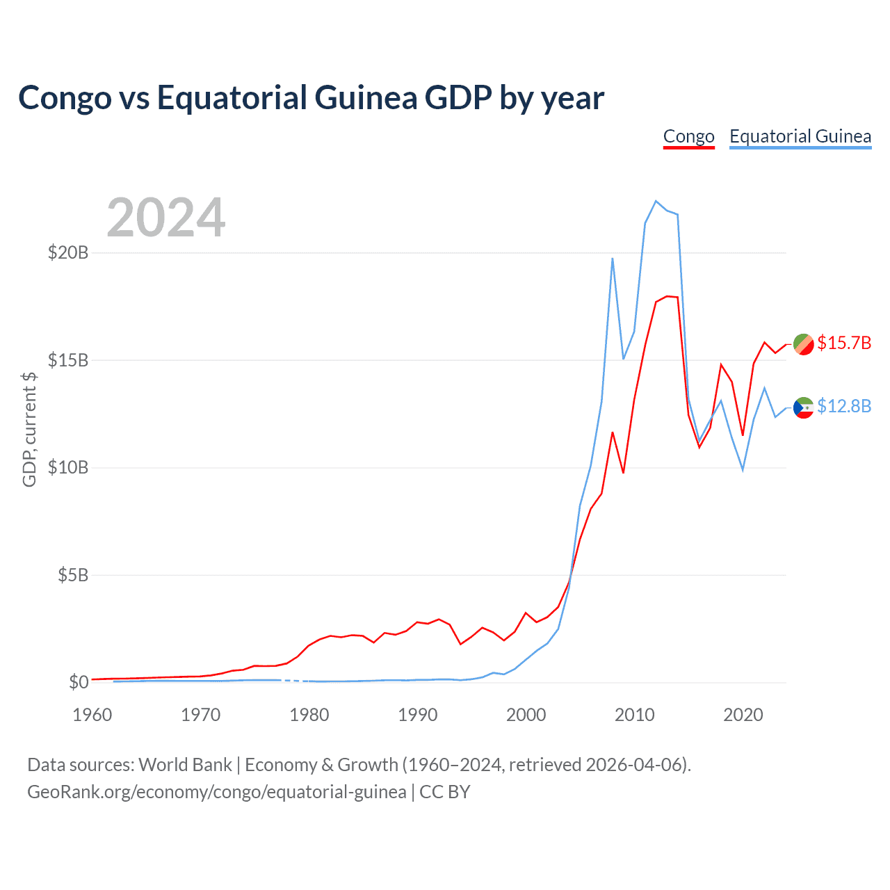 The Congo has a GDP of $15.7B compared to $12.8B for Equatorial Guinea, ranking 141/197 and 148/197 by economy size, respectively.