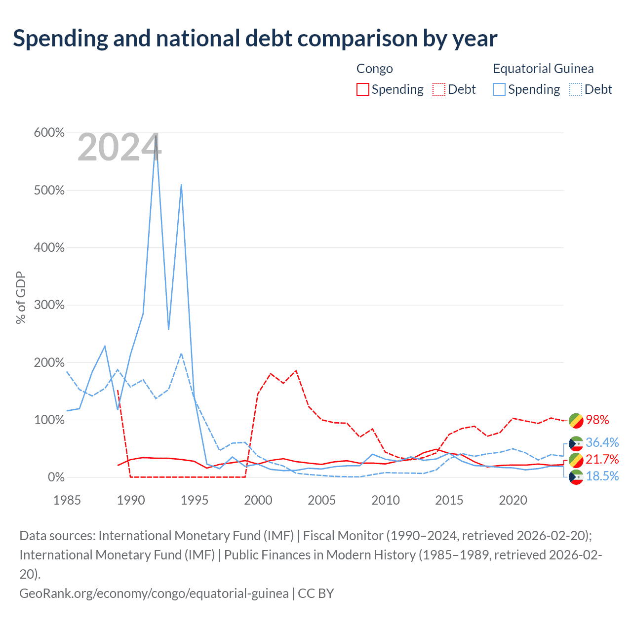 The Congo has $15.4B in government debt (98% of GDP), compared to $4.65B (36.4% of GDP) in Equatorial Guinea.