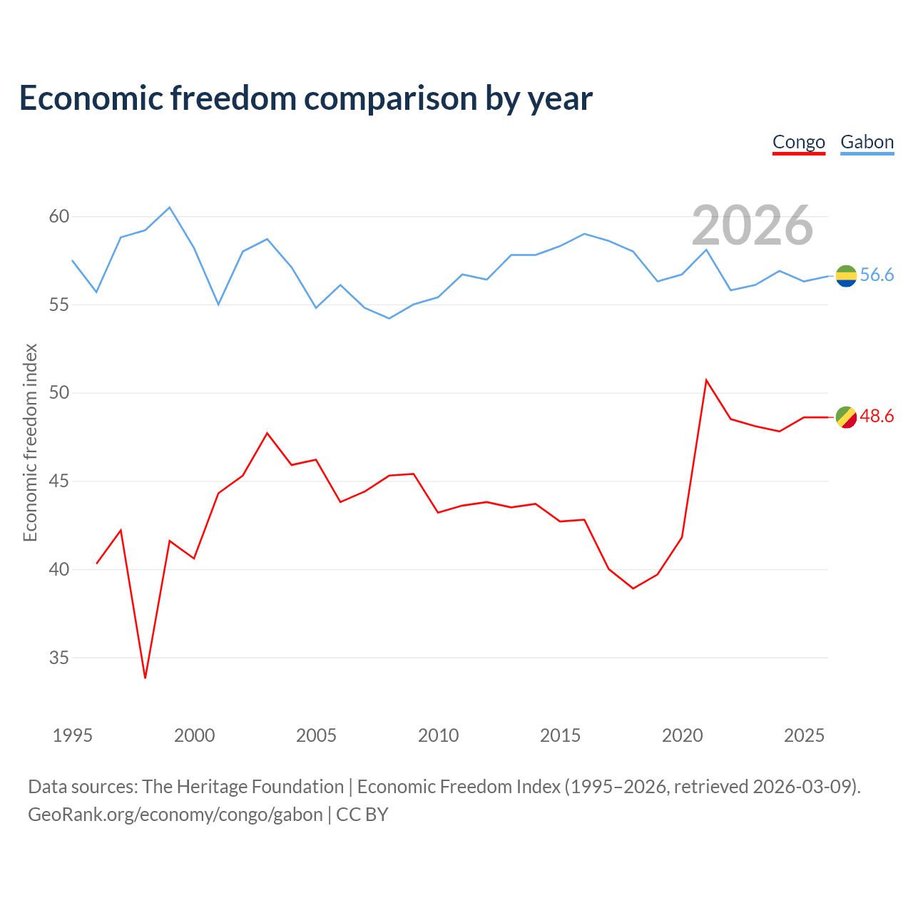 The Economic Freedom Index for the Congo is 48.6, ranking 169/197, compared to 56.6 for Gabon, ranking 120/197. The chart above displays a comparison of annual changes in economic freedom indexes.