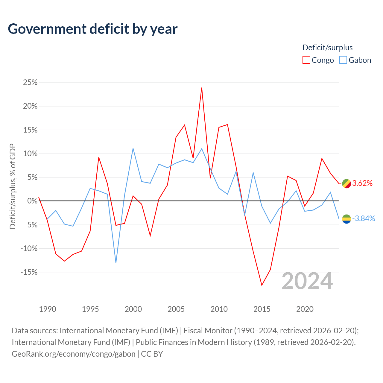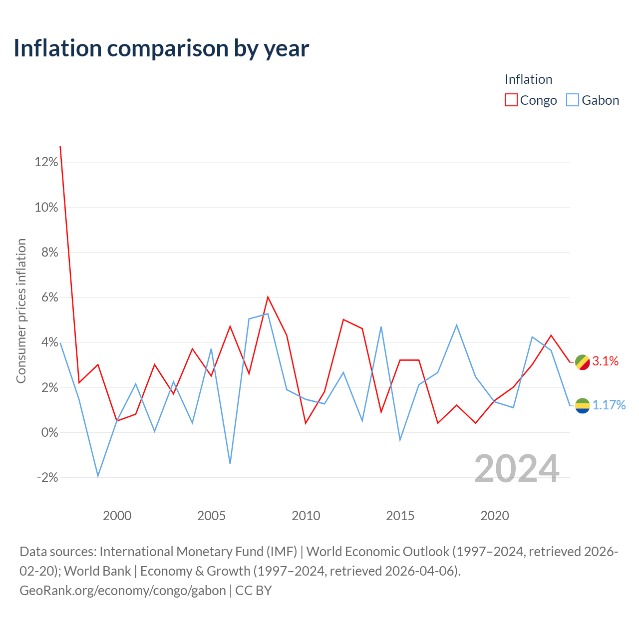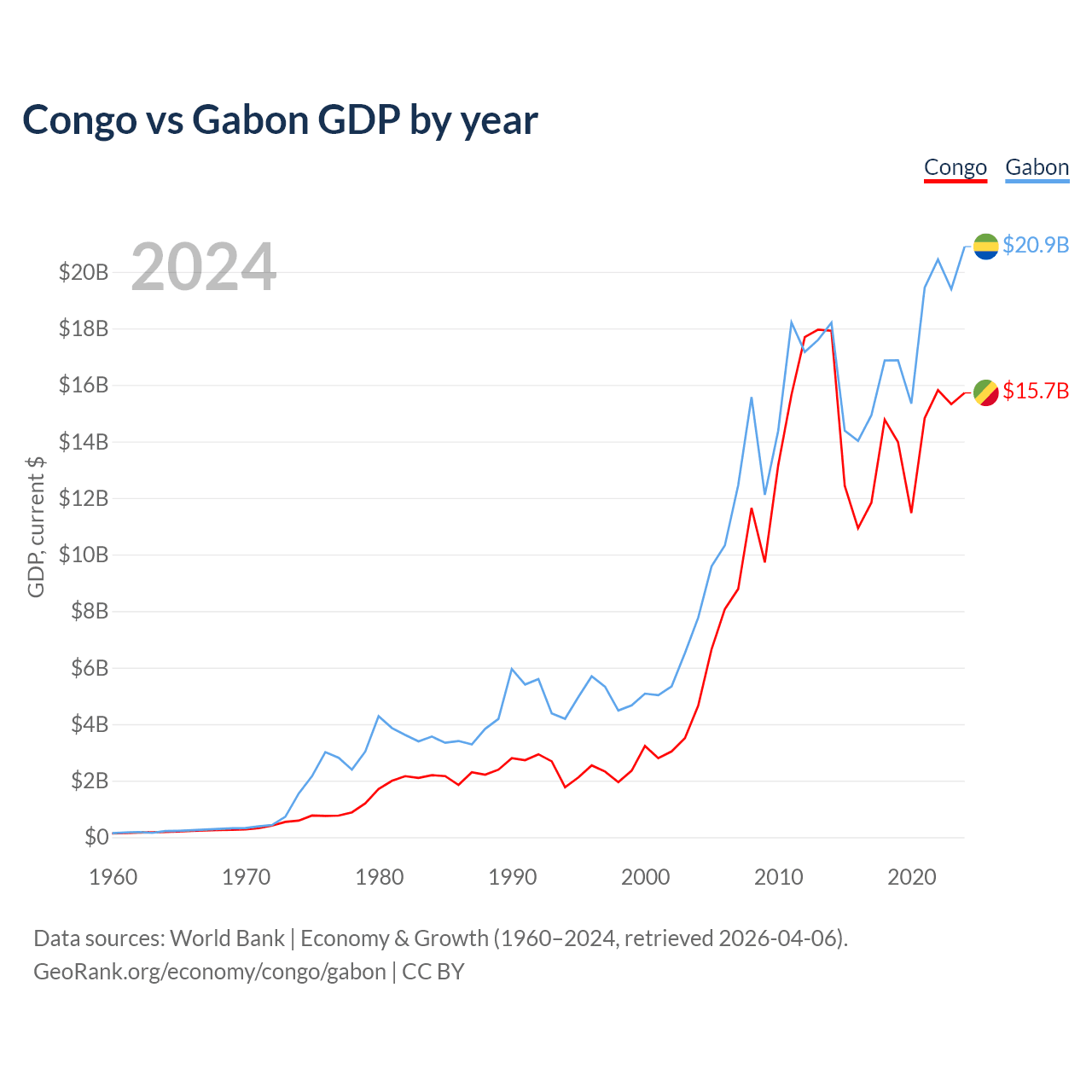 The Congo has a GDP of $15.7B compared to $20.9B for Gabon, ranking 141/197 and 127/197 by economy size, respectively.