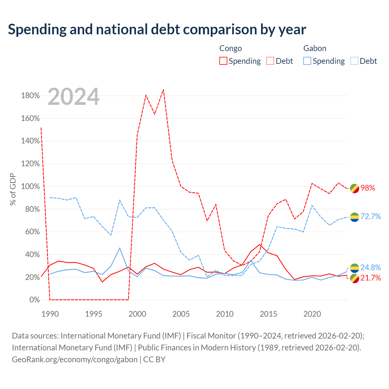 The Congo has $15.4B in government debt (98% of GDP), compared to $15.2B (72.7% of GDP) in Gabon.