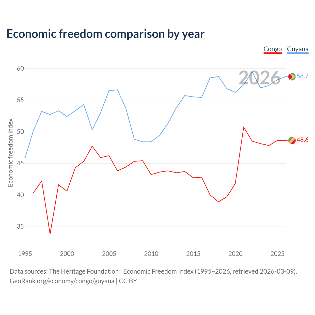 The Economic Freedom Index for the Congo is 48.6, ranking 169/197, compared to 58.7 for Guyana, ranking 109/197. The chart above displays a comparison of annual changes in economic freedom indexes.