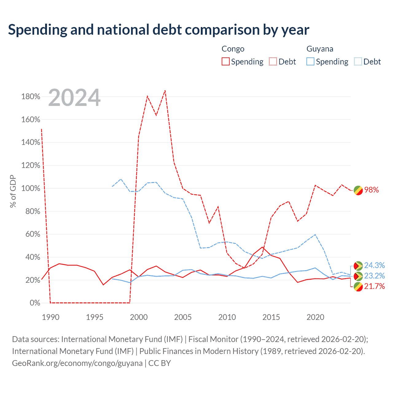 The Congo has $15.4B in government debt (98% of GDP), compared to $5.99B (24.3% of GDP) in Guyana.