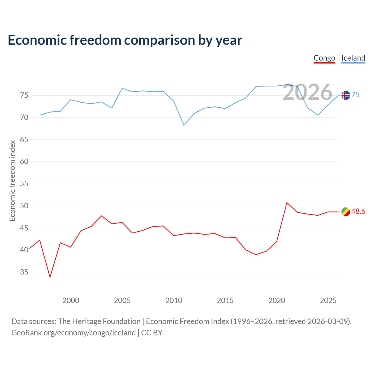 The Economic Freedom Index for the Congo is 48.6, ranking 169/197, compared to 75 for Iceland, ranking 19/197. The chart above displays a comparison of annual changes in economic freedom indexes.