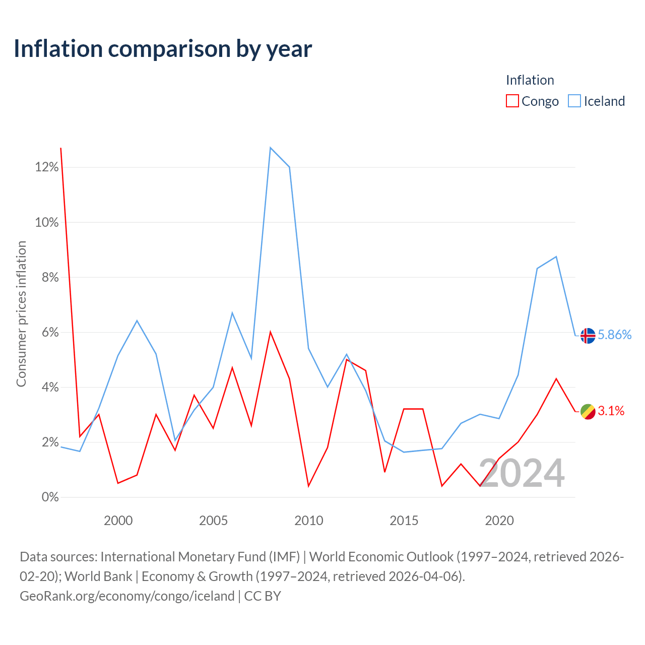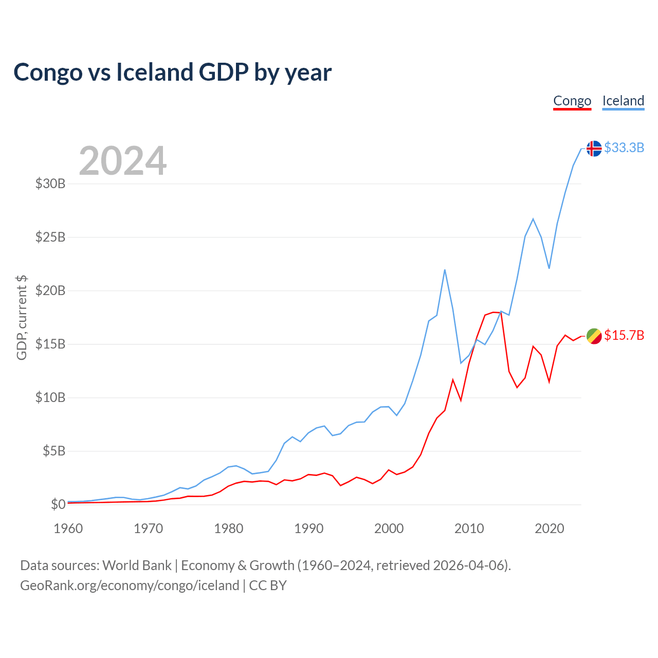 The Congo has a GDP of $15.7B compared to $33.3B for Iceland, ranking 141/197 and 108/197 by economy size, respectively.