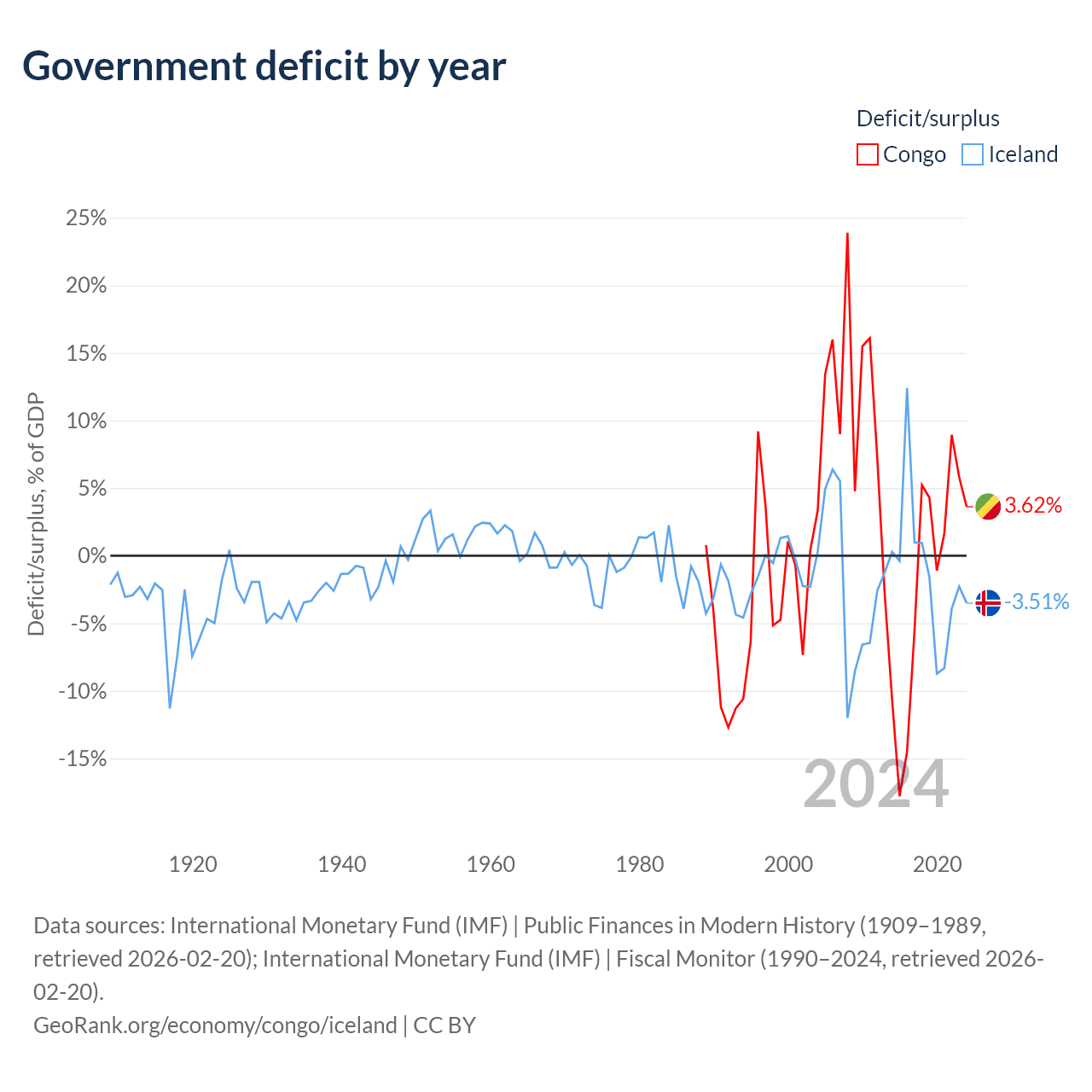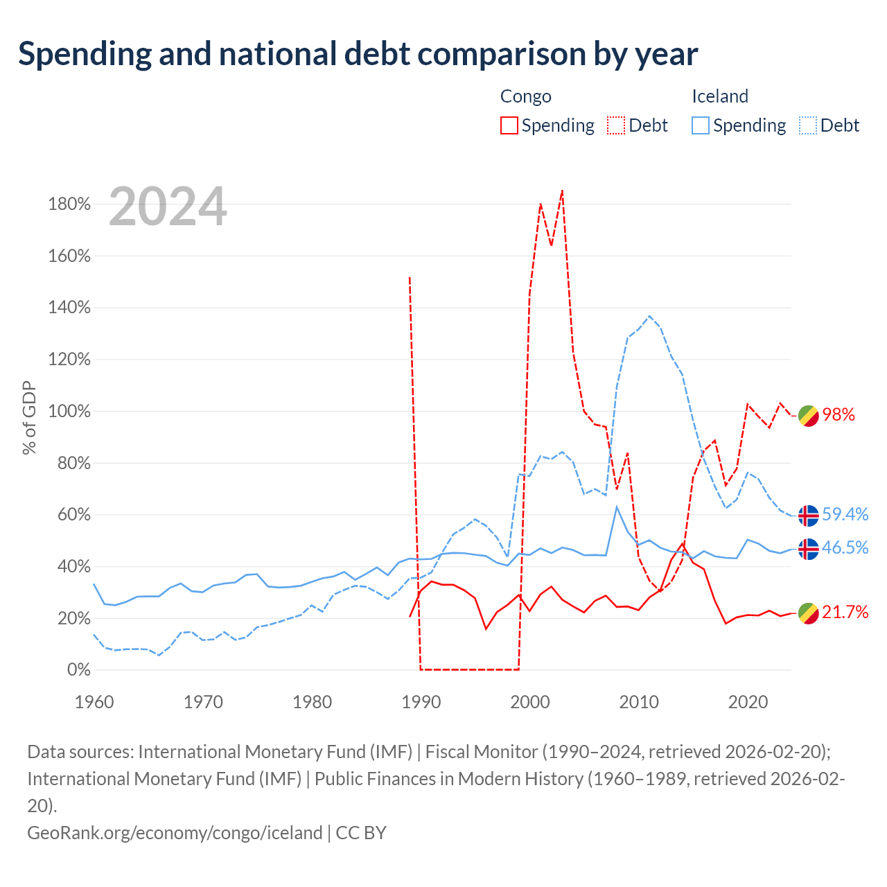 The Congo has $15.4B in government debt (98% of GDP), compared to $19.8B (59.4% of GDP) in Iceland.