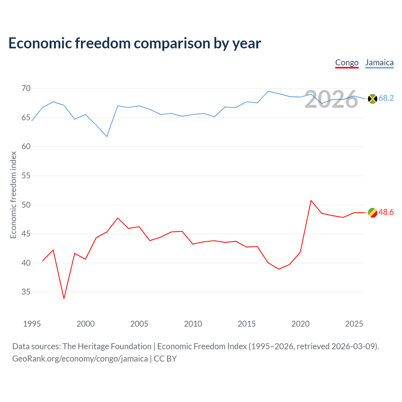 The Economic Freedom Index for the Congo is 48.6, ranking 169/197, compared to 68.2 for Jamaica, ranking 48/197. The chart above displays a comparison of annual changes in economic freedom indexes.