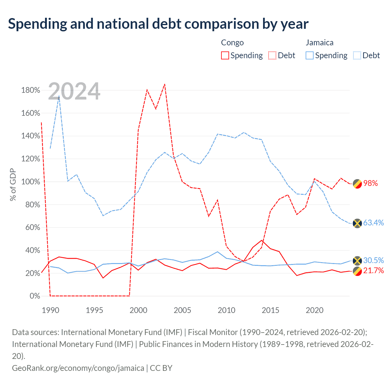 The Congo has $15.4B in government debt (98% of GDP), compared to $14B (63.4% of GDP) in Jamaica.