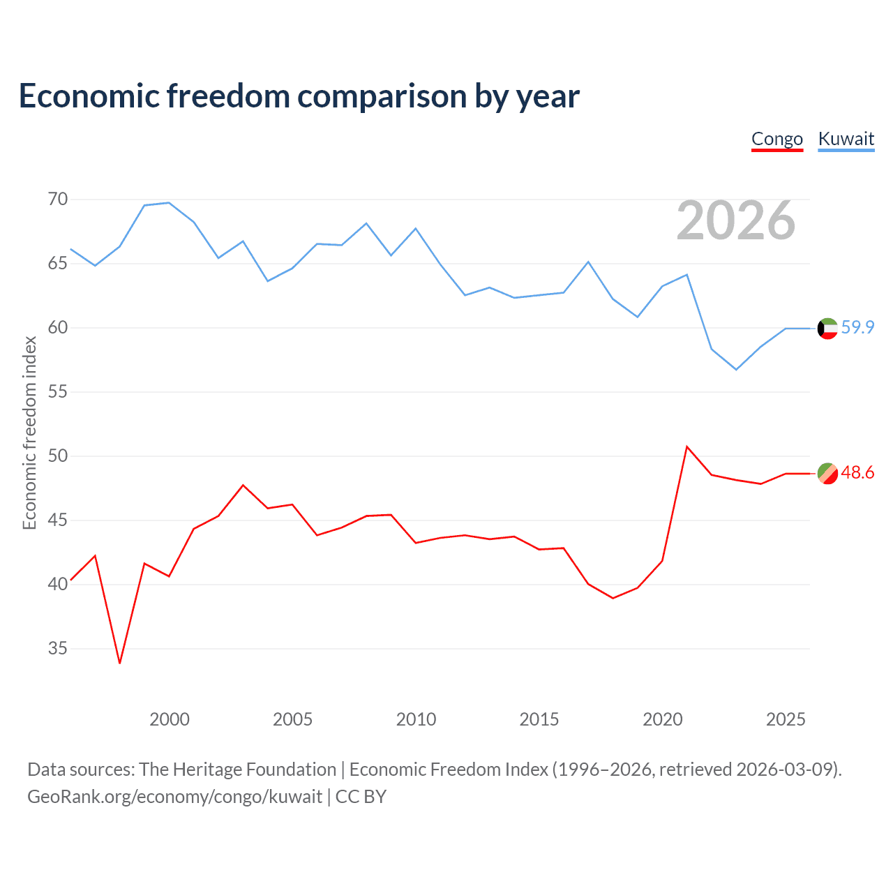 The Economic Freedom Index for the Congo is 48.6, ranking 169/197, compared to 59.9 for Kuwait, ranking 100/197. The chart above displays a comparison of annual changes in economic freedom indexes.