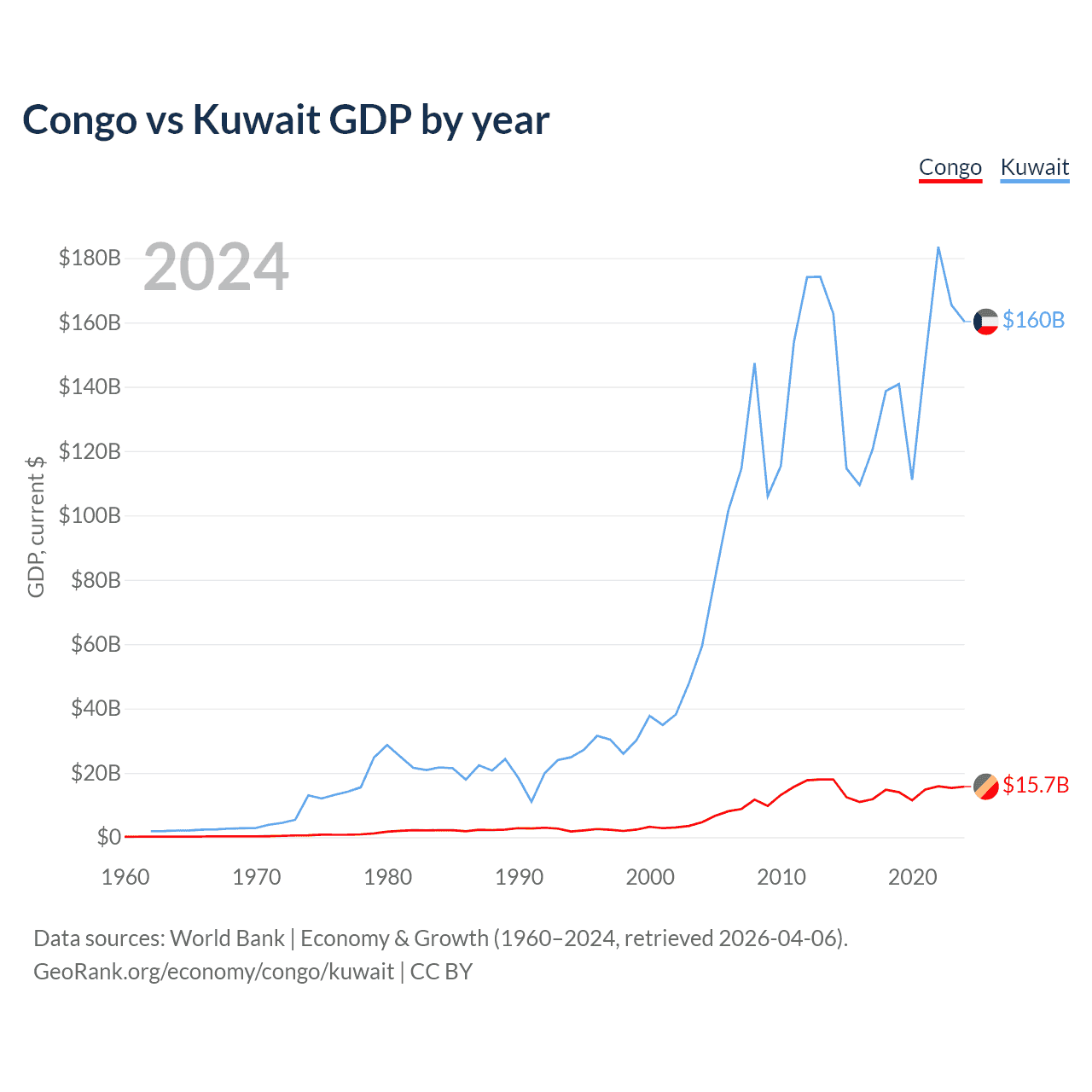 The Congo has a GDP of $15.7B compared to $160B for Kuwait, ranking 141/197 and 59/197 by economy size, respectively.