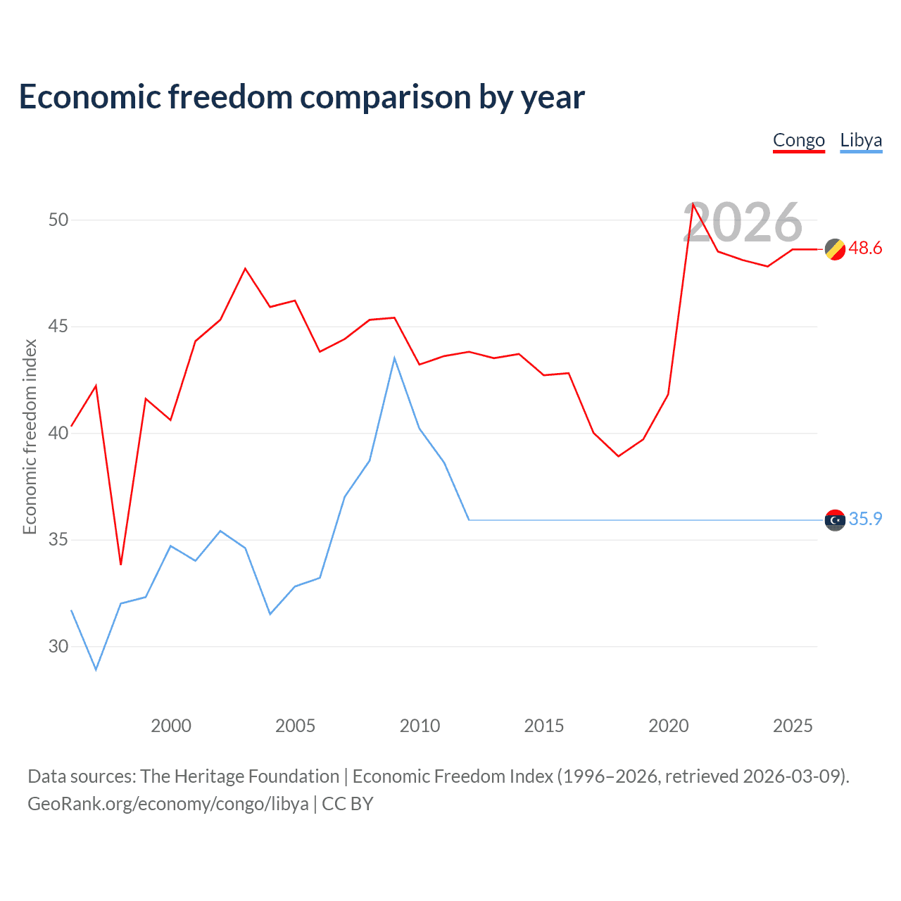 The Economic Freedom Index for the Congo is 48.6, ranking 169/197, compared to 35.9 for Libya, ranking 189/197. The chart above displays a comparison of annual changes in economic freedom indexes.