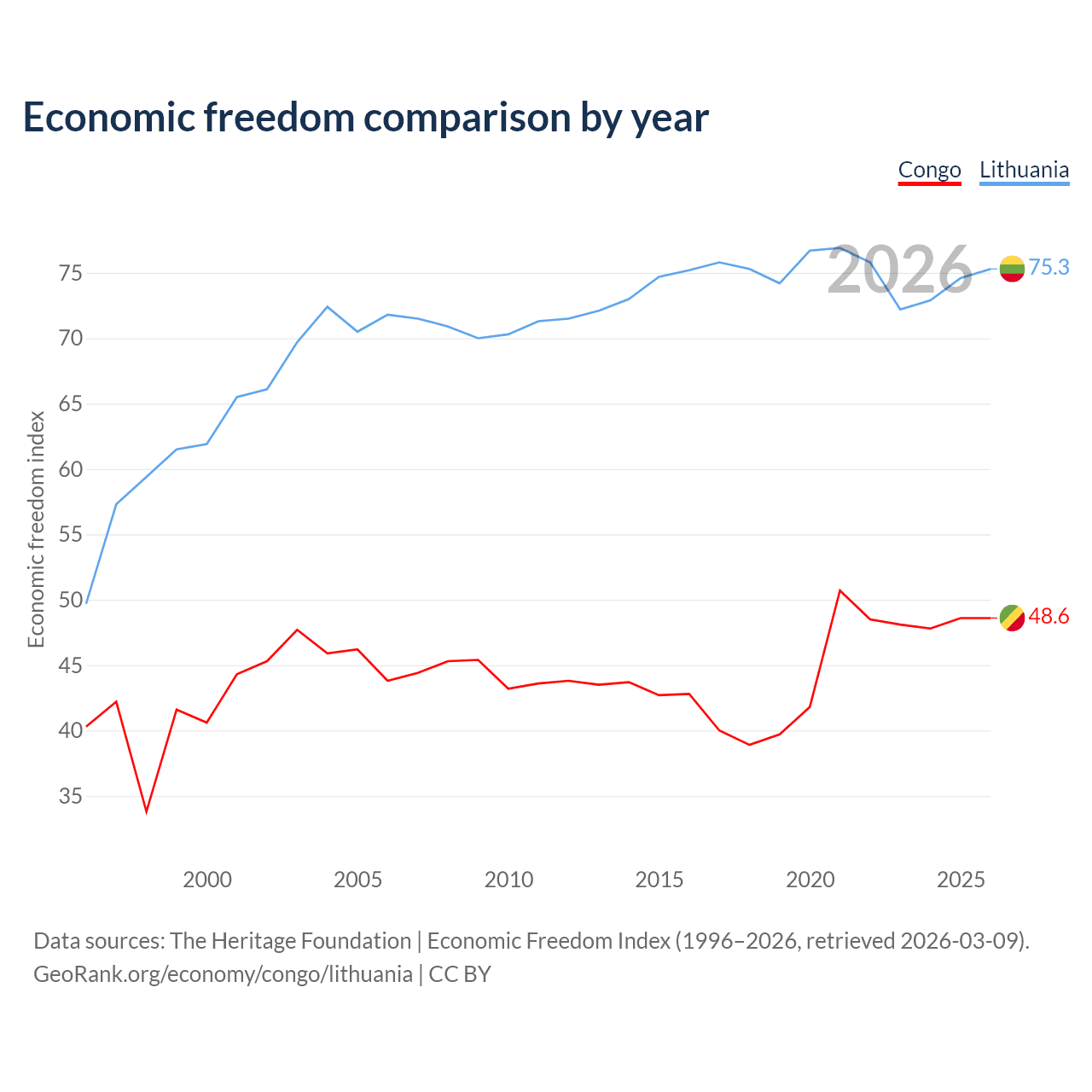 The Economic Freedom Index for the Congo is 48.6, ranking 169/197, compared to 75.3 for Lithuania, ranking 18/197. The chart above displays a comparison of annual changes in economic freedom indexes.