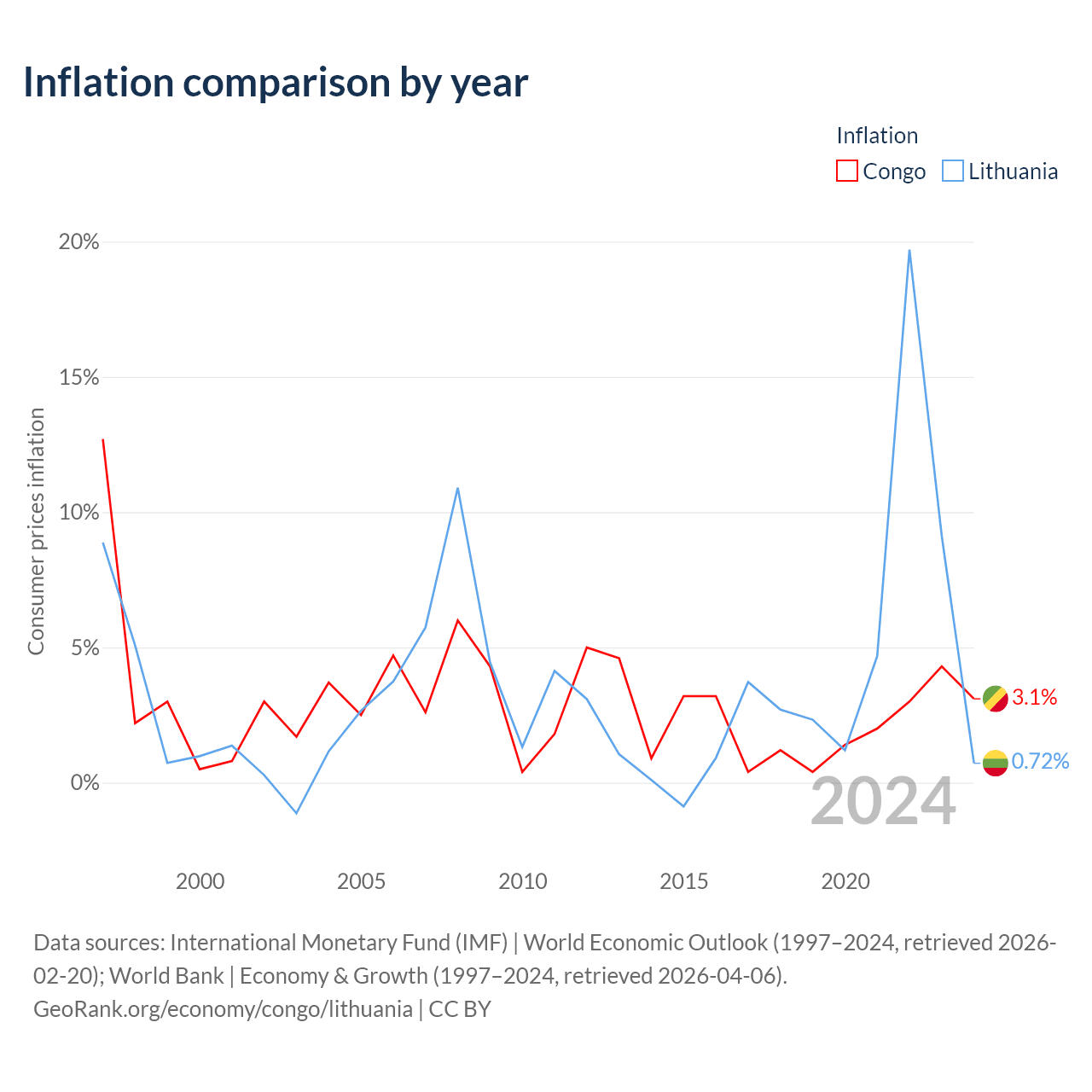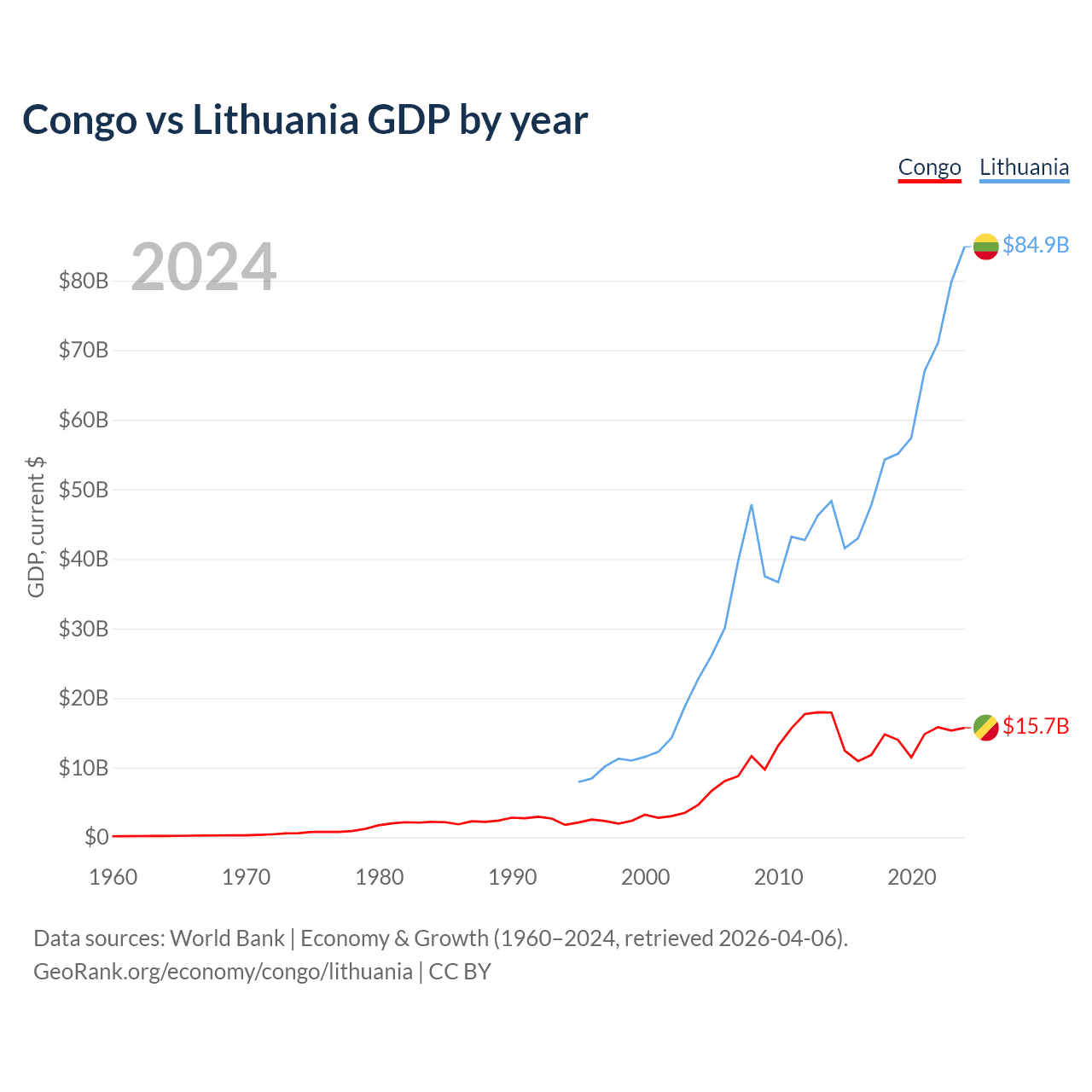 The Congo has a GDP of $15.7B compared to $84.9B for Lithuania, ranking 141/197 and 79/197 by economy size, respectively.