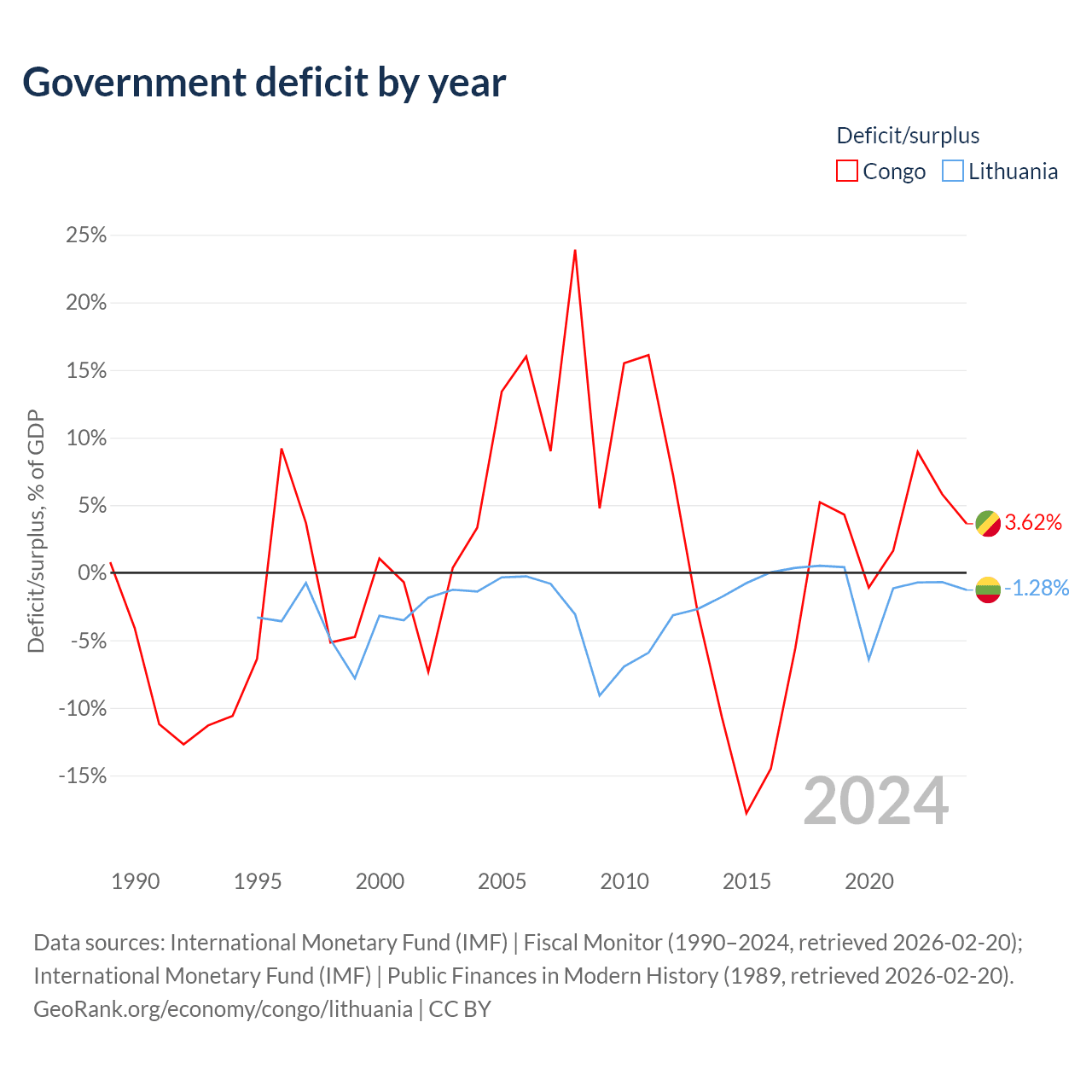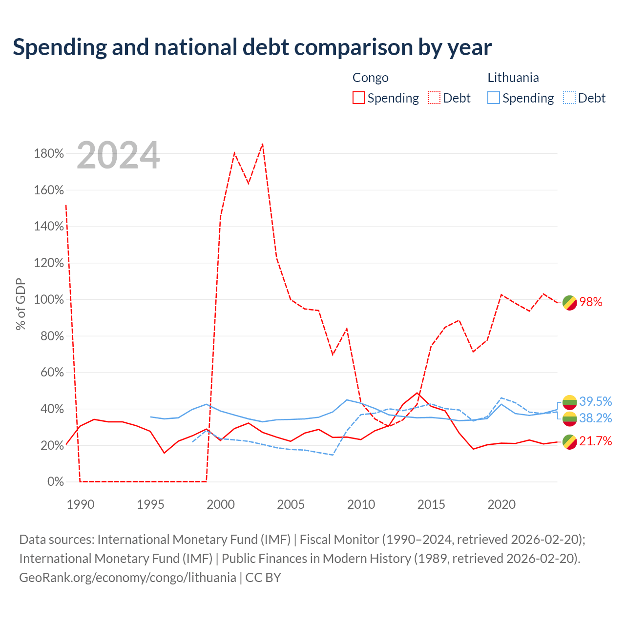 The Congo has $15.4B in government debt (98% of GDP), compared to $32.4B (38.2% of GDP) in Lithuania.